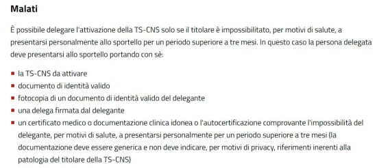 È quindi sufficiente portare documento valido (e relativa fotocopia!!), delega firmata dal delegante, certificato medico o documentazione clinica idonea (anche eventuale autocertificazione sembrerebbe): tale documentazione deve essere generica e non indicare, per motivi di privacy riferimenti alla patologia del titolare della TS-CNS.