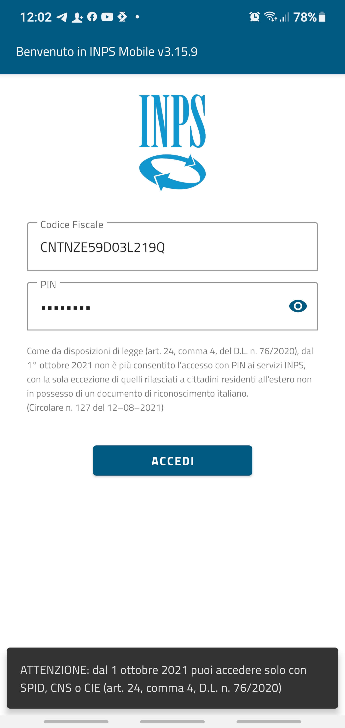 Ho provato ad accedere ieri all’app dell’INPS per vedere i dettagli della pensione mensile e ho avuto la brutta sorpresa di vedermi indicate come errate le mie credenziali INPS che da sempre utilizzo per accedere a quell’app (che memorizzandosele, non me richiedeva più, se non dopo un eventuale aggiornamento dell’app stessa). Questo almeno fino a ieri pomeriggio: ora finalmente il messaggio di rifiuto non indica più l’inesattezza delle credenziali, bensì la nota seguente: “ATTENZIONE: dal 1 ottobre 2021 puoi accedere solo con SPID, CNS o CIE” … anche se poi, in realtà, da quell’app l’accesso con CNS non risulta possibile, almeno attualmente: come si può vedere dagli screenshot seguenti, si deve infatti utilizzare l’accesso web da un browser del sito dell’INPS – sia da PC sia da smartphone – per vedere attivata anche quella terza possibilità di autenticazione (oltre a dover usare un lettore per carte a contatto con chip). Dal momento che non so nemmeno se tali lettori possano funzionare se collegati alla porta micro USB di uno smartphone (esisteranno i driver necessari per quei dispositivi?), sicuramente più agevole è la lettura di una carta contactless tramite lettore NFC, qualora integrato in quel dispositivo.