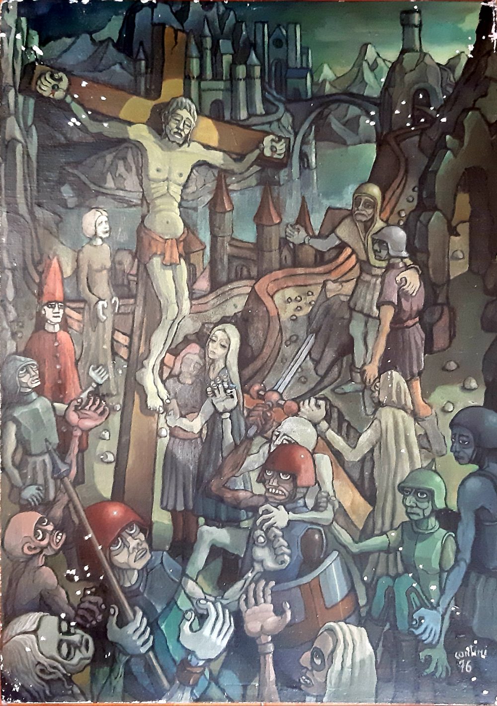 Da qualche settimana ho finito il restauro di un bel dipinto di mio zio Mario (olio su cartone telato 70×50, 1976) che risultava pesantemente danneggiato in più parti, scolorite e talvolta addirittura mancanti. Ho voluto lasciare per ultimo il suo restauro rispetto ad altri dipinti perché lo trovo particolarmente bello e temevo di non essere all’altezza dell’arduo compito. Esiste sempre un certo timore iniziale di poter peggiorare una situazione preesistente già anche quando si tratta di un proprio dipinto in corso: questo timore poi può trasfrmardi in paura quando si tratta di operare su un dipinto di un altro pittore, soprattutto di ino di cui apprezzi la sua arte! Tuttavia, è necessario vincere tali ritrosie, aspettando magari lo stato d’umore più idoneo per trovare il coraggio d’impugnare i pennelli e i colori: questi ultimi generalmente è bene siano della medesima tipologia utilizzata originalmente (e.g. a olio se il dipinto aveva utilizzato quella tecnica), e le tinte devono essere miscelate opportunamente sperimentando diverse tonalità fino a giungere a quella desiderata. Questo comporta non solo perizia ma soprattutto pazienza in quanto talvolta sono richiesti diversi tentativi non essendo sempre l’esito ottenuto necessariamente quello sperato! Avevo già da tempo addirittura preso un libro che mostrava le diverse tonalità di colore che si ottengono mischiando le diverse tinte, ma poi ho scoperto che ovviamente sono indicazioni di massima, in quanto sia non tutte le specifiche tinte di colore non risultano agevolmente reperibili (poche marche le producono), sia le caratteristiche di un colore dipendono anche dalla marca stessa del prodotto effettivamente utilizzato: sta quindi sopratutto alla sensibilità personale diluire e miscelare a dovere il tutto con diversi colori per ottenere davvero il colore desiderato, … o perlomeno uno assai simile 🙂! Anche se dispiace, non ci si deve preoccupare troppo di dover ricominciare da capo, sprecando quindi colori e misture provate ma che non hanno poi dato l’esito sperato: magari si possono poi utilizzare per ritoccare qualche altro punto del dipinto! Non sempre è opportuno fare delle proveiniziali con piccoli quantitativi di colore: spesso è invece opportuno preparane un quantitativo sufficiente per quello che si deve fare, in quanto non è sempre agevole ricreare la medesima tonalità soprattutto quando i colori adoperati sono più di due, come generalmente avviene!