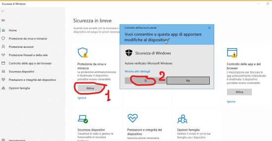 A questo punto, una volta ripartito il PC, basta tornare nella sezione di Sicurezza in Windows/Windows Defender (ad esempio ricercandola con la lente di ricerca di Cortana dalla barra in basso) e attivare la protezione da virus e minacce, che è tornata a essere gestibile dall’utente: dopo quella modifica nel registry è infatti ritornato il pulsante Attiva ed è scomparsa quella segnalazione in rosso relativa all’ipotetica gestione della sicurezza da parte di una fantomatica organizzazione!)