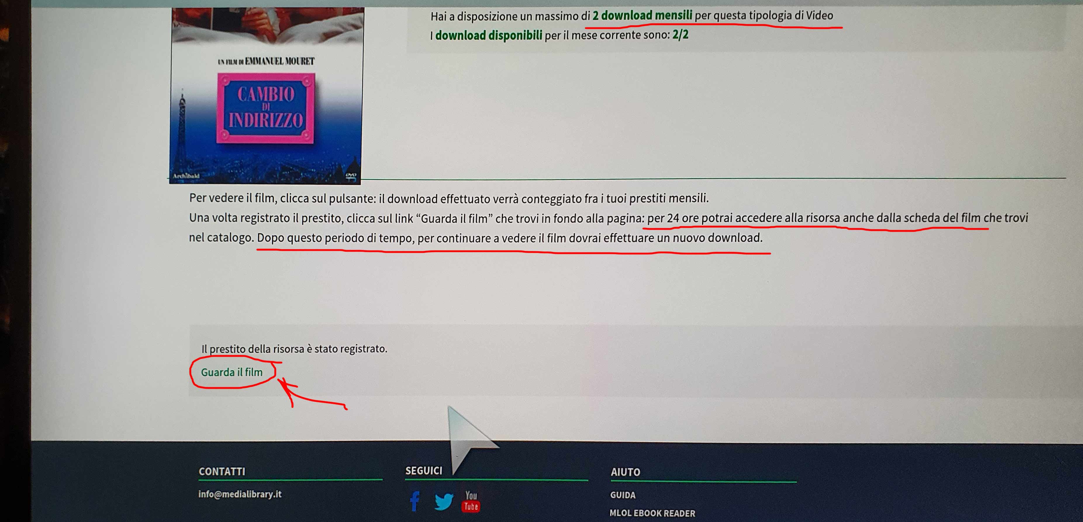 Una volta premuto il pulsante Guarda, compare una pagina dove è indicato il numero di download ancora possibili tra i 2 mensili a disposizione per ciascun account: viene anche specificato che cliccando sul link Guarda il film (in fondo la pagina a sinistra) per 24 ore uno può accedere alla risorsa anche dalla scheda del film che si trova nel catalogo. Trascorso quel periodo, per continuare a vedere il film è necessario effettuare un nuovo download (presumibilmente bruciandosi così un’ulteriore possibilità di visione, ma personalmente non ho provato!).