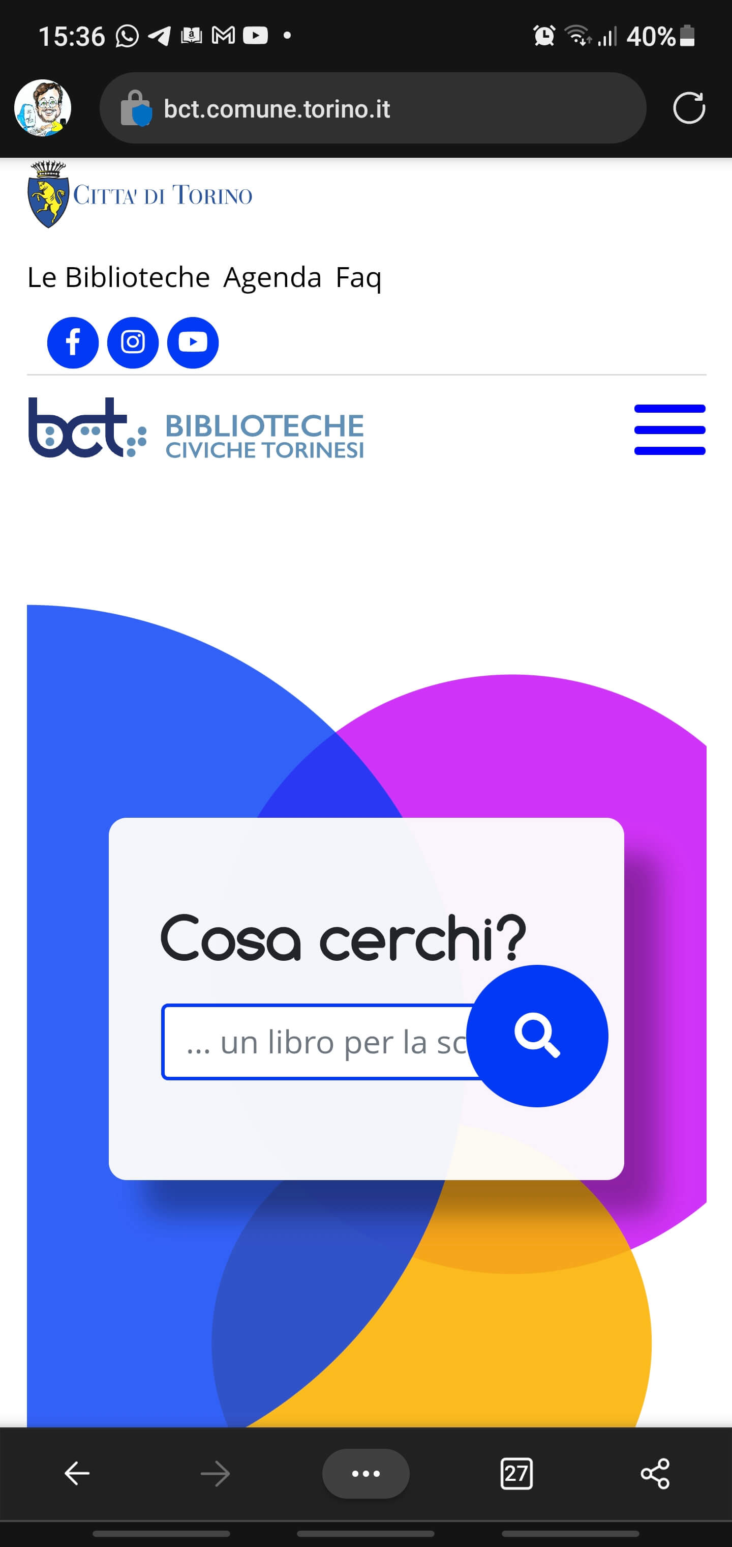 Il sito delle Biblioteche Civiche Torinesi, raggiungibile con qualsiasi browser sia da PC sia da smartphone, fin dalla sua homepage mostra le molteplici attività culturali, tra eventi, programmi, catalogo online delle opere (libri, giornali, riviste, CD, DVD) disponibili in tutte le biblioteche della mia città. Esiste anche la possibilità d’iscriversi a una newsletter fornendo semplicemente la propria email, in modo da essere avvertiti per tempo delle nuove iniziative. Penso che anche in altre città esista un qualcosa di analogo e comunque sicuramente vale per i servizi online. Di particolare interesse reputo infatti l’iniziativa di rendere disponibile anche una biblioteca digitale (e-book, audiolibri, musica da ascoltare, film) online 24 ore su 24, senza necessità di nessun abbonamento.