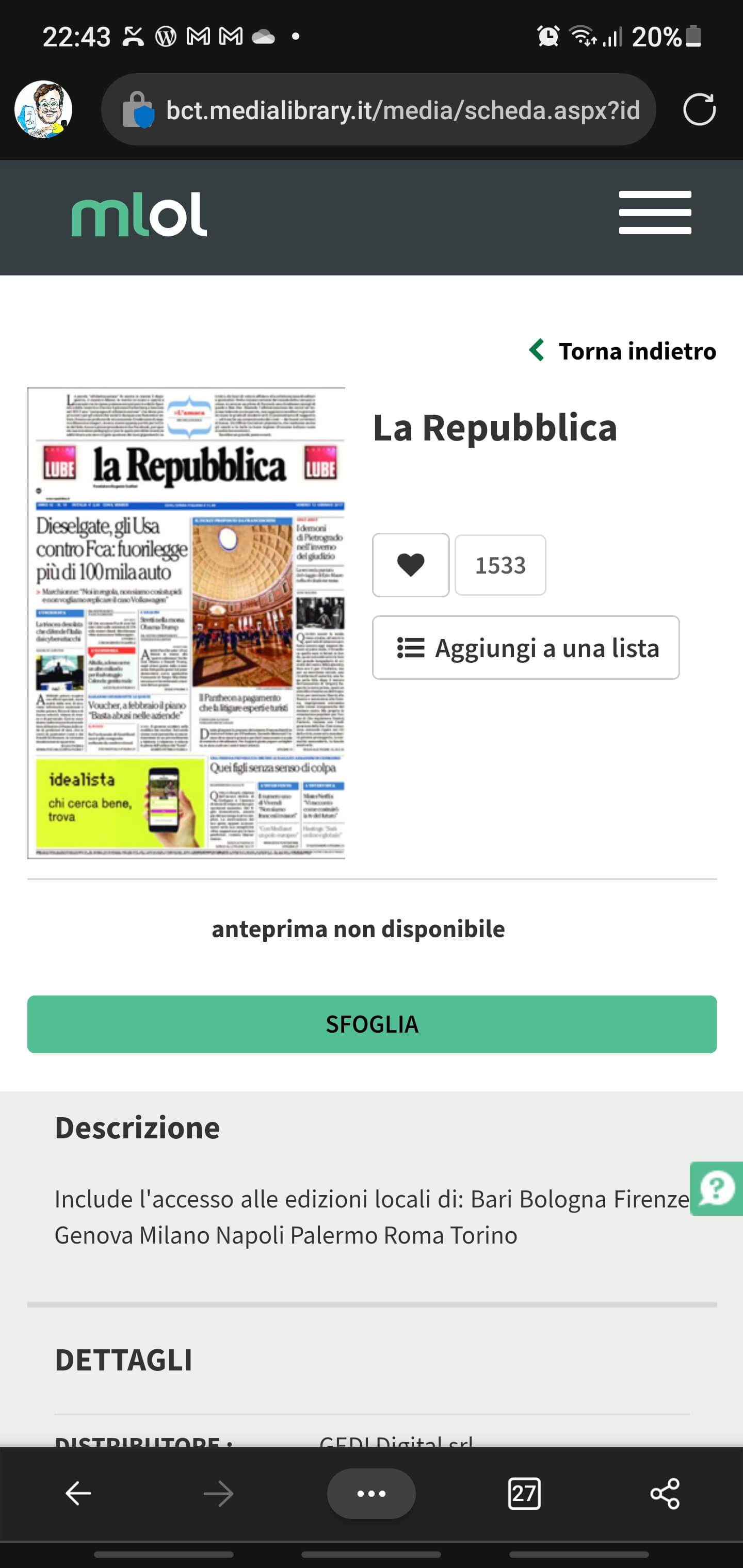 Si può accedere anche a riviste/quotidiani (attualmente 7.173 MLOL e 32.644 OPEN), sebbene anche qui il numero di lettori contemporanei sia limitato, per cui può succedere, nel richiederne la lettura di uno specifico, che compaia il messaggio “Tutte le licenze sono occupate“: come si apprende sempre dalle F.A.Q., questo messaggio può capitare con i quotidiani che fanno parte del pacchetto Edicola Italiana e indica che è stato raggiunto il numero massimo di utenti che possono consultare il quotidiano contemporaneamente: in questo caso prova a consultare il quotidiano in altri momenti e non appena una licenza tornerà disponibile, potrai accedervi regolarmente.