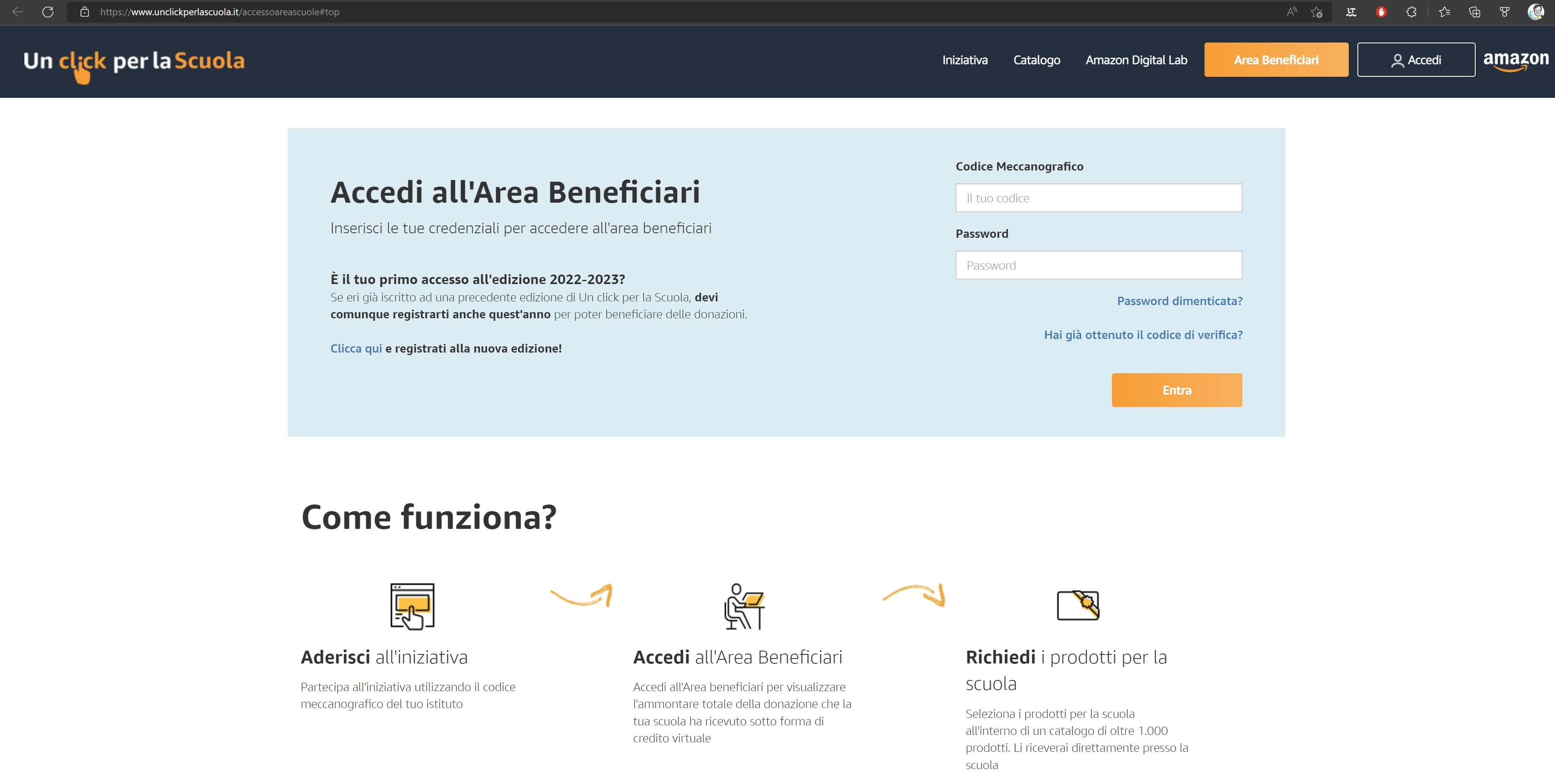 Andando nell’area scuole di quella iniziativa, si legge infatti: “Inserisci il tuo codice meccanografico e segui le istruzioni che riceverai subito dopo all’indirizzo email ufficiale della scuola. Anche se eri già iscritto a una precedente edizione di Un click per la Scuola, devi comunque registrarti anche quest’anno per poter beneficiare delle donazioni“.