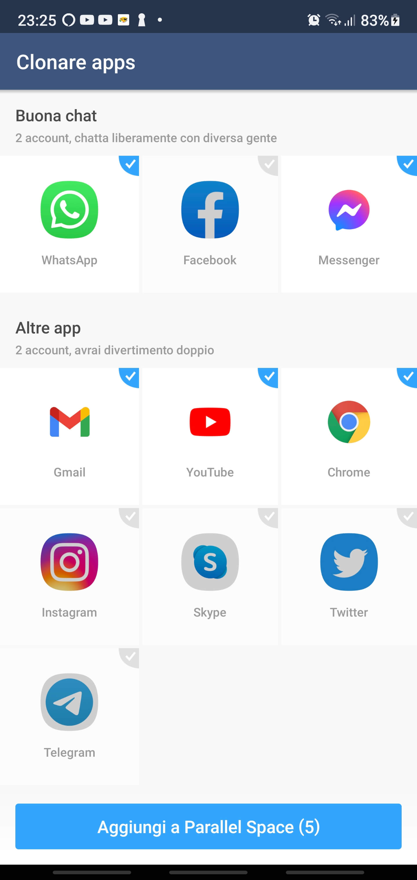 In particolare ne ho provata una Parallel Space. Sebbene appena lanciata proponga la clonazione delle solite app social/messaggistica, qualora se ne lasci selezionata solo una (che successivamente si potrà comunque cancellare anch’essa!), poi viene consentito di scegliere anche altre app generiche tra quelle che uno ha installato sul proprio smartphone.