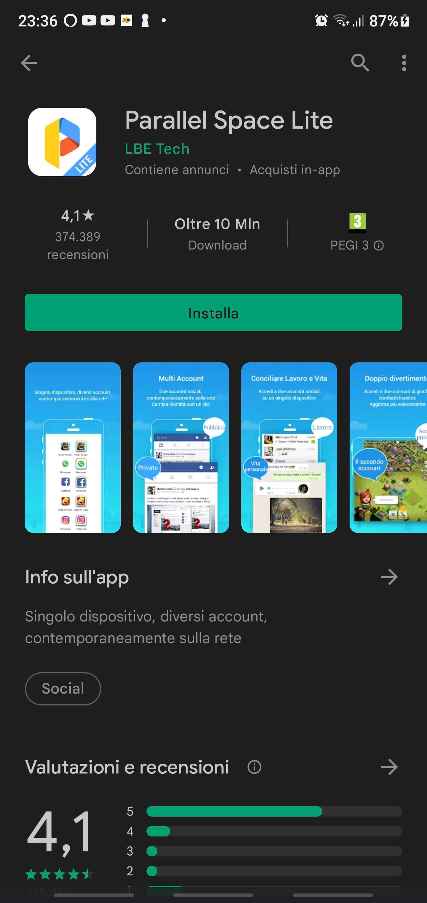 Qualora invece si abbia un‘esigenza di gestire un doppio account su app generiche, si può ricorrere ad alcune app presenti nel PlayStore che – accettando il fardello della pubblicità – possono essere installate anche gratuitamente: se poi si ritiene che funzionino bene per il proprio scopo , ovviamente si può sempre poi acquistare la loro versione a pagamento per avere eliminata la pubblicità!