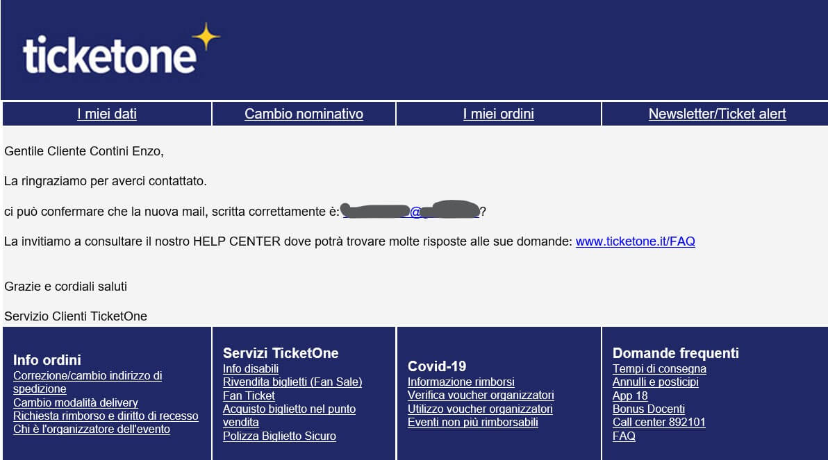 Inizialmente, spiegando che non riuscivo a procedere nell’acquisto in quanto non veniva accettato il mio codice fiscale duplicato in un altro account collegato a una email aziendale che non possedevo più, mi è stato infatti semplicemente risposto “Il suo codice fiscale risulta da lei già associato al profilo con indirizzo…” 🙄 … ma non glielo avevo già detto io? Ma poi, con quella loro risposta, il problema da me evidenziato era stato risolto? 🤔