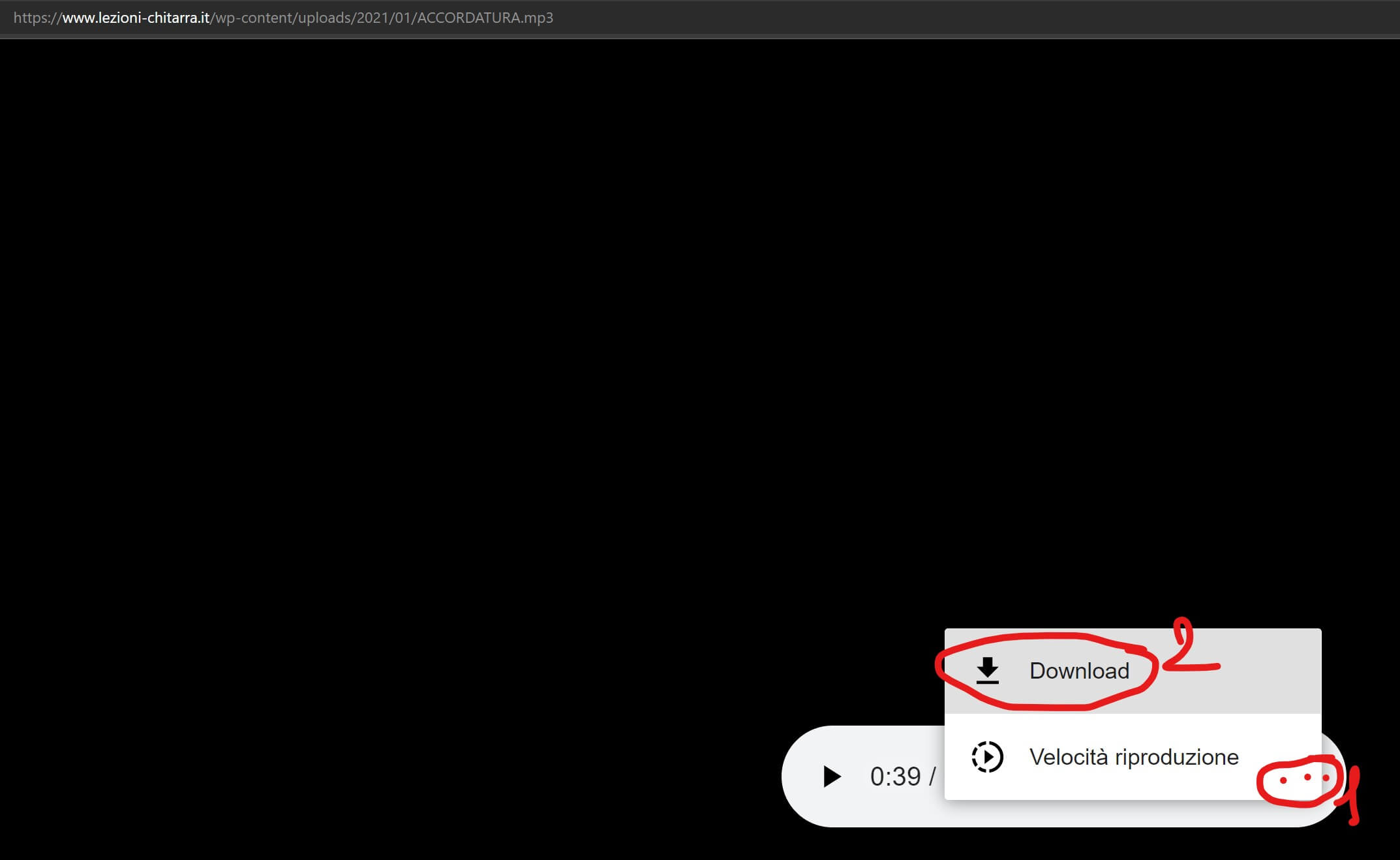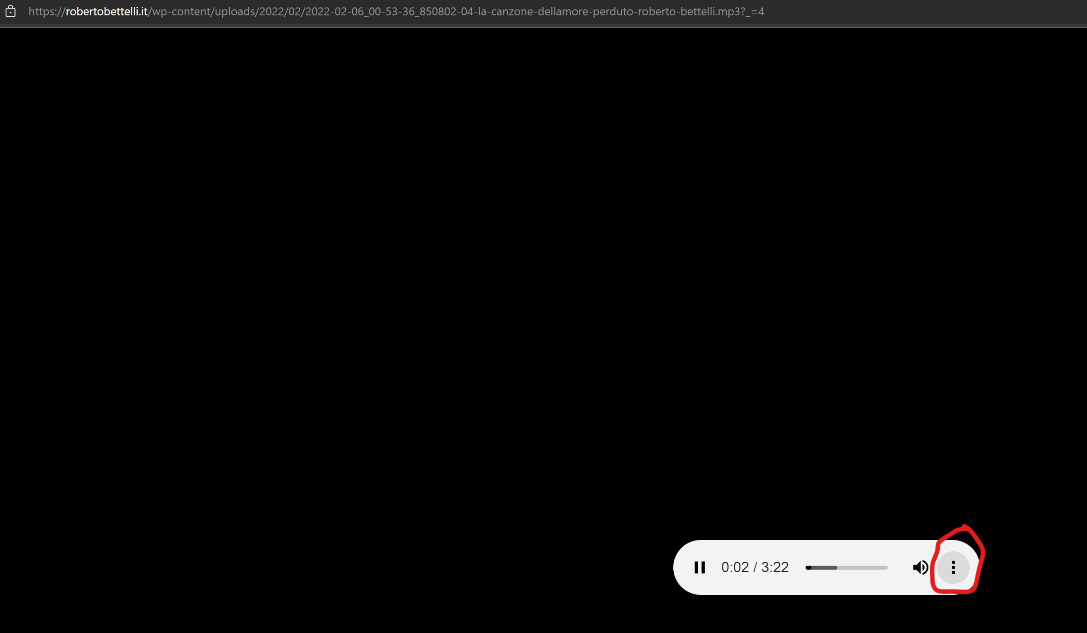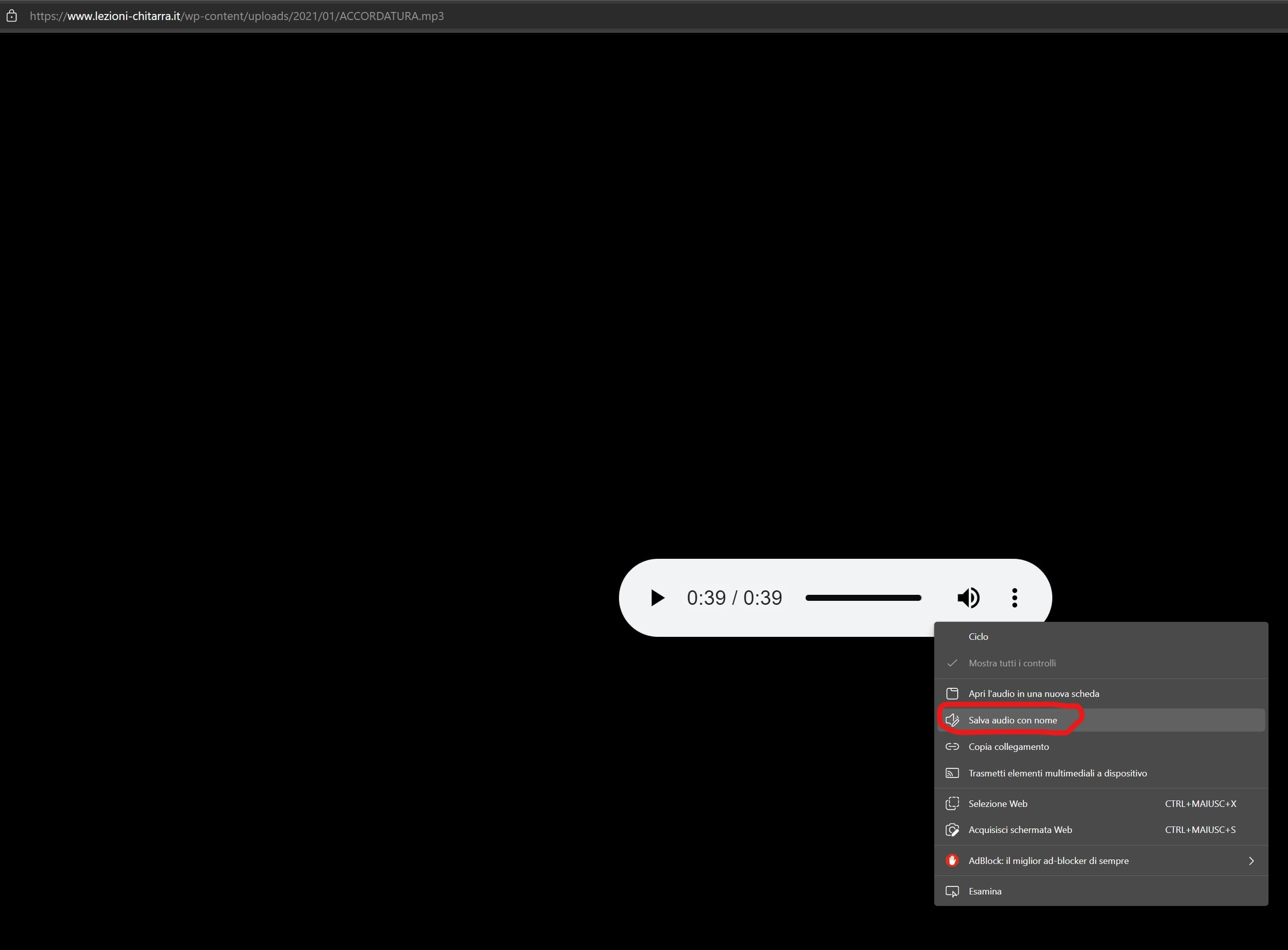 Il componente di default che riproduce il file mp3 nel browser Edge, consente infatti anche di scaricarlo in locale sia cliccando con il tasto destro e scegliendo “Salva audio con nome” sia cliccando sui tre punti (“…”) e quindi selezionando “Download“:
