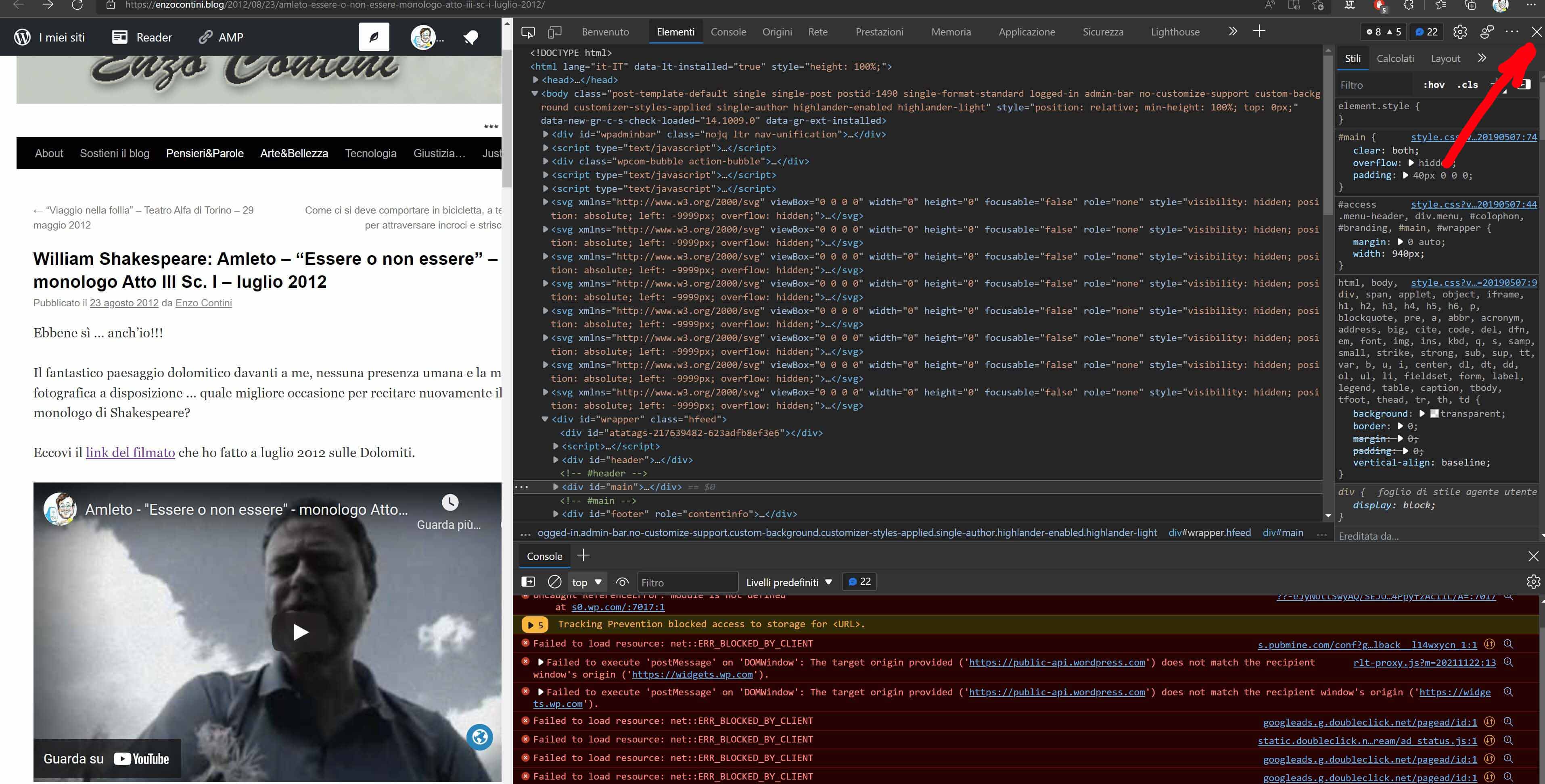 Si noti che, come alternativa ad andare sulla voce Altri strumenti -> Strumenti di sviluppo del menù di Edge, si può visualizzare ancor più agevolmente quella medesima sezione anche cliccando con il tasto destro su una parte “vuota” (e.g. non un’immagine o altro componente specifico) di una qualsiasi pagina di un sito che si vuole analizzare e scegliendo Esamina dal menù che compare: per chiudere poi quella modalità di visualizzazione basta anche qui fare click sulla X in alto a destra. Se invece, da quelle opzioni del menù, si sceglie Visualizza origine pagina (CTRL + U), viene solo visualizzato (in un altro tab del browser) il codice HTML di quella pagina: