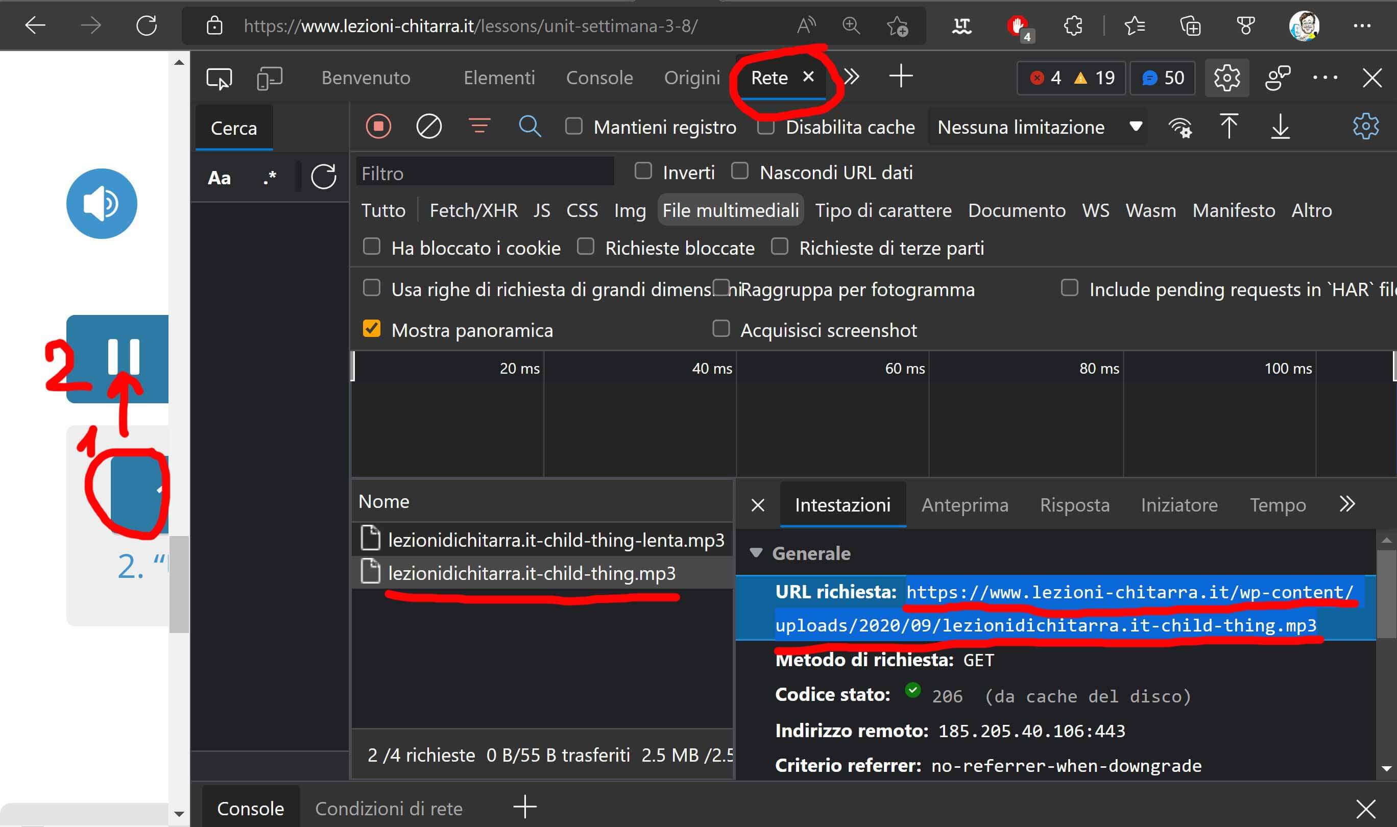 Qualora, come spesso avviene, non se ne trovano, si passa alla sezione del tool relativa a ciò che transita in rete (tab Rete), in quanto probabilmente, agendo sullo specifico widget che consente la riproduzione in streaming del brano musicale/video, si vedrà transitare appunto la URL dal medesimo utilizzata per effettuare quello streaming. Infatti, per iniziare la riproduzione di ciascun brano, agendo su ciascuno dei widget presenti nel sito (che rimane visibile sulla sinistra) compaiono sullo strumento di debug (a destra) delle righe relative a file multimediali qualora si sia selezionato il sub-tag File multimediali di quella sezione Rete per effettuare opportunamente il filtraggio di ciò che sta transitando in rete, essendo noi interessati appunto ai contenuti multimediali. Facendo quindi click sul Nome del file richiesto, se ne vedono i dettagli e in particolare l’URL da cui è stato richiesto lo streaming: