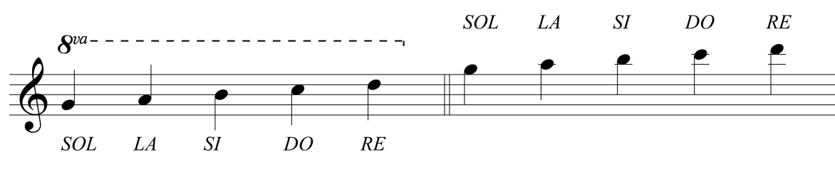 A completare il pentagramma, esistono infine dei segni detti segni di ottava i quali hanno l’effetto di alzare o abbassare di un’ottava i suoni che abbracciano. Ad esempio, nel pentagramma seguente le note scritte sul lato sinistro della figura, sotto al segno 8va, equivalgono a quelle scritte sul lato destro della figura, perché il segno di ottava alta ci indica che tutte le note da lui abbracciate vanno suonate all’ottava superiore: