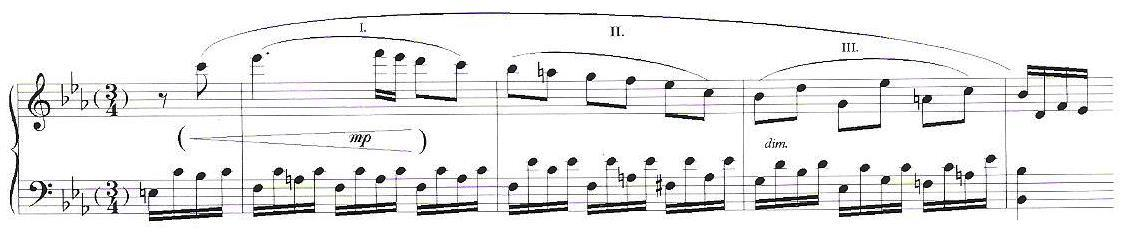 • Legatura di frase: analoga alla precedente, ma contempla un numero maggiore di note. Posta su tutta la frase musicale o su una parte di essa, è frequente il caso in cui una legatura di ampie dimensioni abbracci altre legature di più piccole dimensioni. La più ampia, che è una legatura di frase, segna la divisione dei periodi, delle frasi o delle mezze frasi, mentre le altre, che sono chiamate sotto-legature indicano le parti più piccole, come i frammenti di frase e gli incisi. S’intende che le sotto-legature in confronto alle altre legature hanno minore importanza e quindi devono avere un’accentazione meno rivelante: