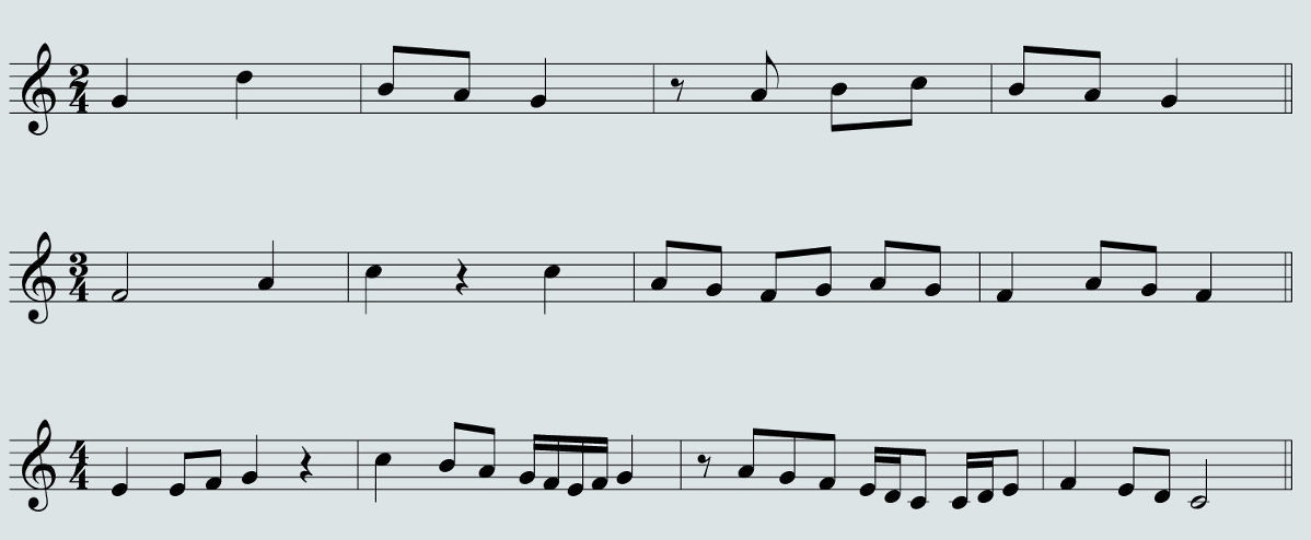 Riga 1 -> tempo di 2/4Riga 2 -> tempo 3/4Riga 3 -> tempo di 4/4