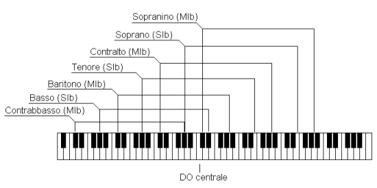 La chiave di basso, detta anche chiave di Fa (nota sul 4o rigo, al livello dei due punti del simbolo che la caratterizza), serve per scrivere suoni con registro più grave rispetto alla chiave di violino e per questo si colloca al di sotto di quest’ultima. Entrambe le chiavi si incontrano sul Do centrale (Do3, cioè la terza ottava) evidenziato nell’immagine seguente: con ottava si definisce la distanza tra una nota e la medesima nota più in alto o più in basso e tale termine si usa anche per misurare l’estensione degli strumenti (e.g. una chitarra ha generalmente una estensione di 4 ottave, poco più di una normale voce umana). Una stessa nota o melodia può essere suonata identica a ottave diverse (e.g. spesso uomini e donne cantano la stessa melodia a un’ottava di distanza).
