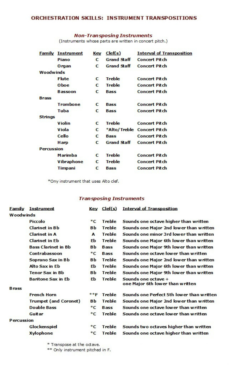 Gli strumenti traspositori sono per la maggior parte strumenti a fiato e sono basati su una nota fondamentale diversa dal DO; ciò comporta che la loro scala naturale sia trasposta rispetto alla scrittura. Ad esempio, gli strumenti in SIb intonano un tono sotto rispetto alla scrittura per cui la loro parte deve essere scritta un tono sopra rispetto al suono reale (e.g. trasportata rispetto a una partitura classica per strumenti in DO). Si noti che, se quello strumento fosse realizzato nella tonalità DO (in modo tale che i suoni scritti corrispondano al suono reale) avrebbe una lunghezza minore, per cui il timbro del suo suono risulterebbe alquanto diverso (una colonna d’aria più corta produce meno armonici di una più lunga): questo è il motivo della scelta di una diversa nota fondamentale per quello strumento.