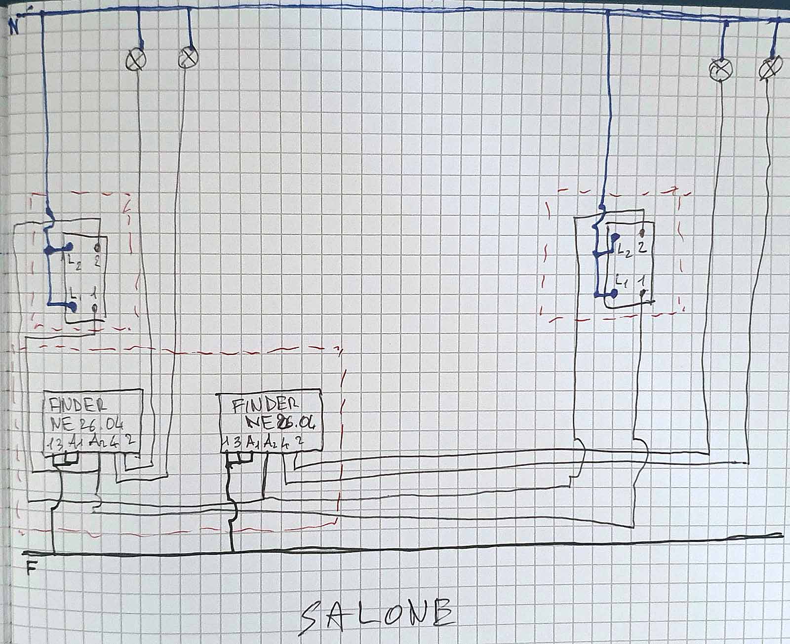 Nel caso di un corridoio, per l’accensione /spegnimento in simultanea di tutte le luci da più parti ho invece usato un più semplice relè della Finder, serie 26.01: