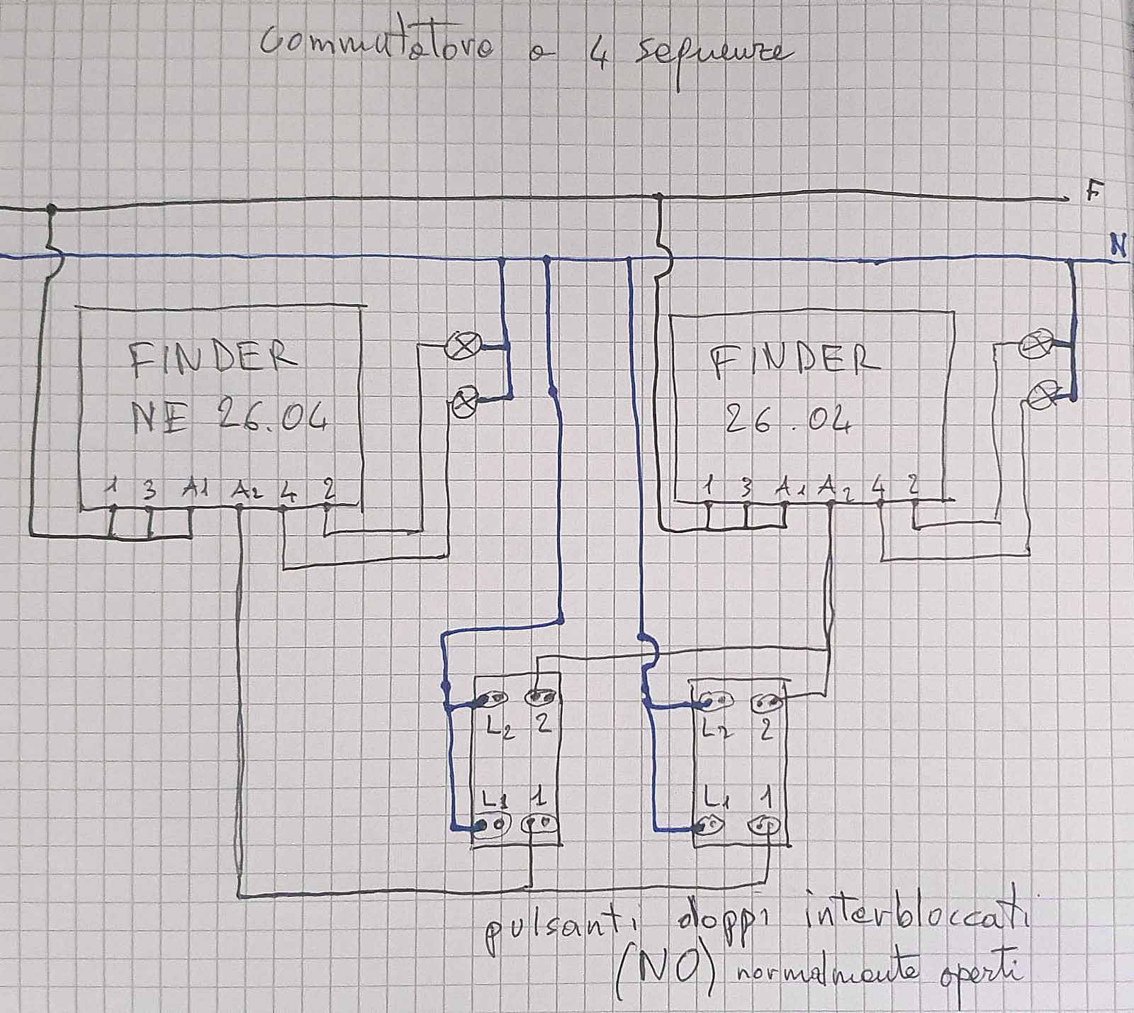 In particolare avevo una stanza con due lampadari ciascuno dei quali poteva accendere tutte le sue lampadine o solo una sua metà: desideravo pilotare il tutto da due punti utilizzando però un unico frutto in quanto gli altri spazi erano già occupati per pilotare altre luci. In pratica, con un solo frutto volevo accendere/spegnere totalmente/parzialmente indipendentemente ciascuno dei due lampadari. La soluzione adottata è stata quella d’impiegare sia un pulsante doppio interbloccato (NO = Normally Open) in ciascuno dei due supporti da cui volevo comandare le accensioni, sia due relè della Finder, in particolare quelli della serie 26.04 (collegati con il neutro, in quanto richiedono che il comando dai pulsanti venga dato con un neutro). Questa tipologia di pulsante doppio è generalmente utilizzata per pilotare i motori delle persiane elettriche ma, in questo contesto in cui è abbinata a quei relè, uno dei due pulsanti (e.g. quello con la freccia in su) consente di accendere totalmente o parzialmente uno dei due lampadari, mentre l’altro pulsante (e.g. quello con la freccia in giù) invece pilota analogamente l’accensione/semi-accensione1/semi-accensione2/spegnimento dell’altro lampadario. Nel seguito mostro sia lo schema elettrico sia come sono stati collocati fisicamente: