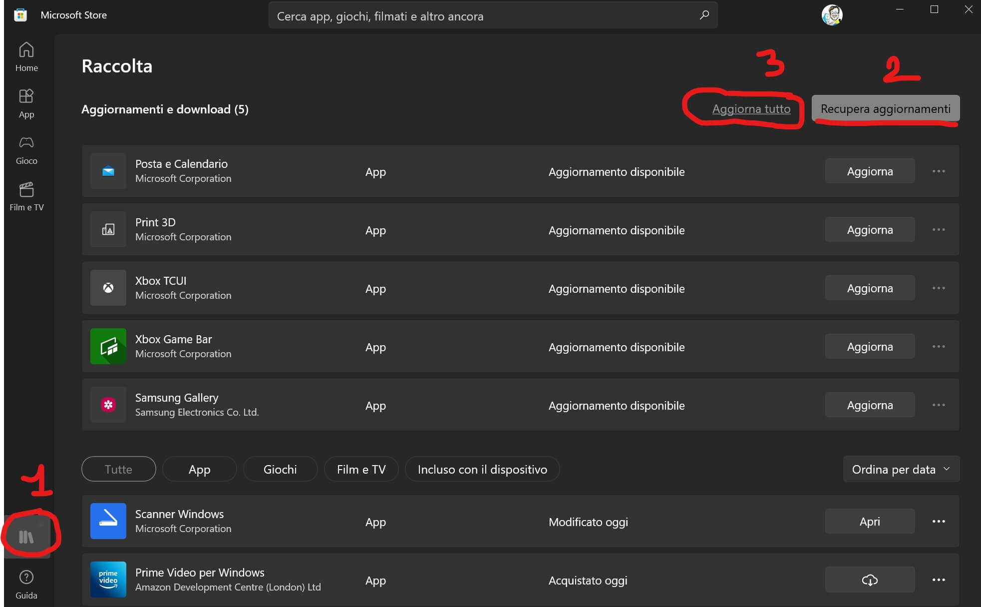 Lo stesso discorso vale per le app presenti sul proprio PC Windows per il quale conviene andare nel Microsoft Store, selezionare l’icona Libreria nel menù laterale (a sinistra in basso) e quindi anche qui scegliere se aggiornare tutto o solo alcune delle app elencate di cui esiste una nuova versione. Analogamente si può anche forzare la ricerca di eventuali nuovi aggiornamenti per altre app, dal momento che questo check viene effettuato per default periodicamente (se impostato a ON Aggiornamenti app) e può quindi succedere che l’elenco presente non sia del tutto aggiornato: