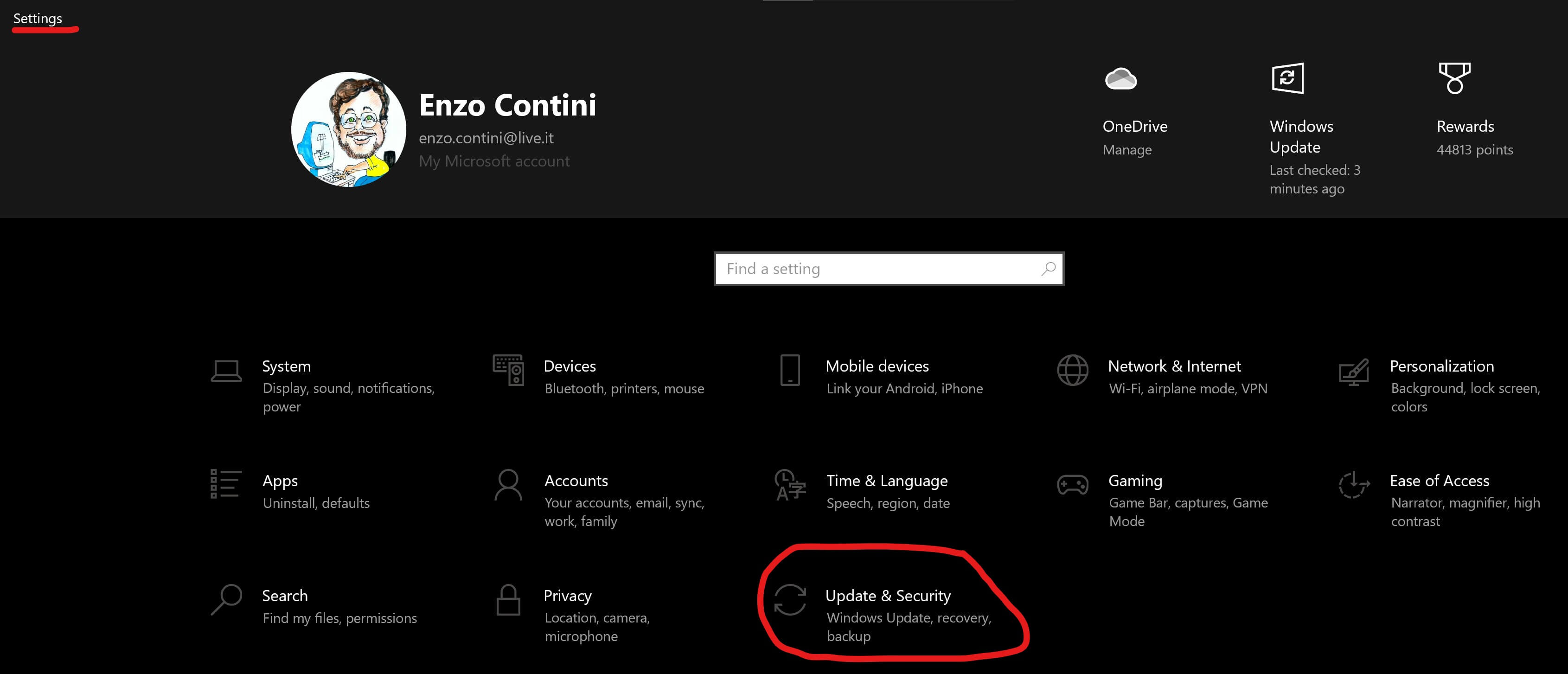 Per trovare poi gli aggiornamenti del sistema operativo Windows, si deve lanciare Windows Update: questo è bene farlo almeno una volta al mese. Lo si può trovare nelle Impostazioni [ENG: All settings] raggiungibile sia dal menù che compare premendo l’icona a bandiera (a sinistra) dalla barra strumenti in basso [ENG: toolbar] sia premendo l’icona delle notifiche sempre su quella barra ma a destra: si noti che in quest’ultimo caso può essere che quel pulsante Impostazioni/All settings non si veda, ma questo è dovuto solo al fatto che se non è stato collocato nella prima riga di tutti i pulsanti visualizzabili. In questo caso è sufficiente premere su Espandi [ENG: Expand] per vedere visualizzati tutti i pulsanti tra cui sicuramente compare anche quello!