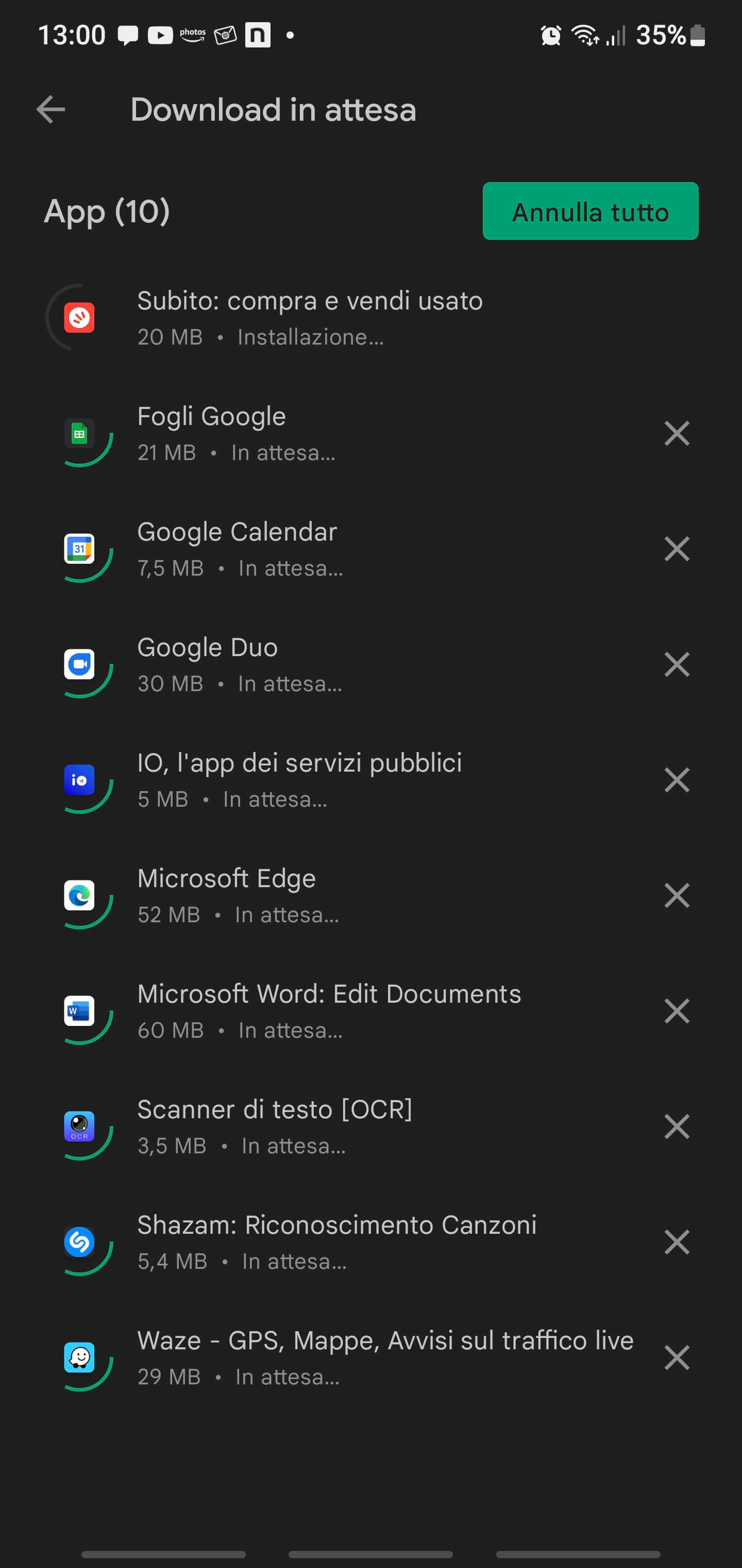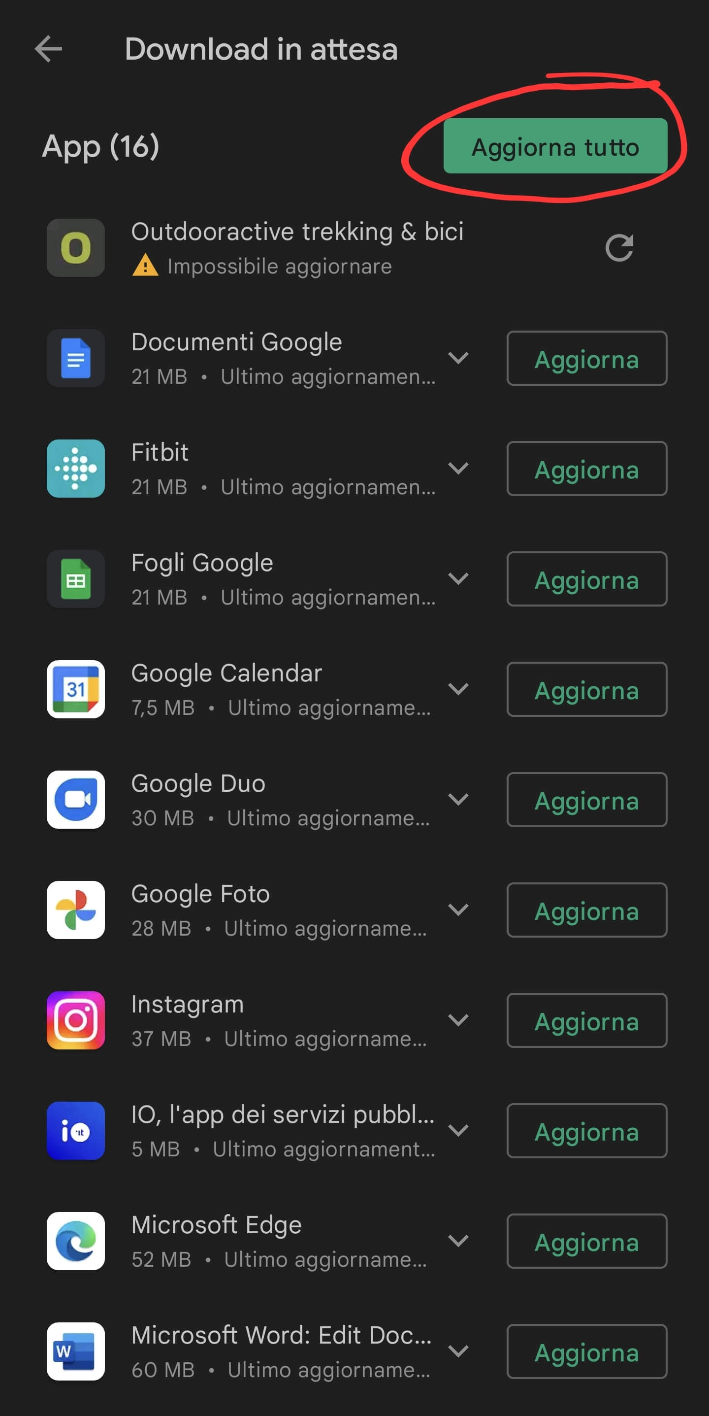 Nel seguito mostro gli screenshot utili sia a verificare che l’opzione di aggiornamento delle app in automatico sia attivo e avvenga solo con connessioni WiFi sia a forzare comunque un aggiornamento manualmente andando a vedere la presenza di eventuali nuove versioni delle app installate. Noterai che molto spesso, pur avendo impostato l’aggiornamento in automatico, uno si ritrova decine di app non ancora aggiornate all’ultima versione!! 🙄🤔 Si noti infine che anche andado a ricercare nel PlayStore un’app specifica che uno ha già installato, se ne esiste una nuova versione viene mostrato un pulsante Aggiona chw ne propone l’aggionamento.