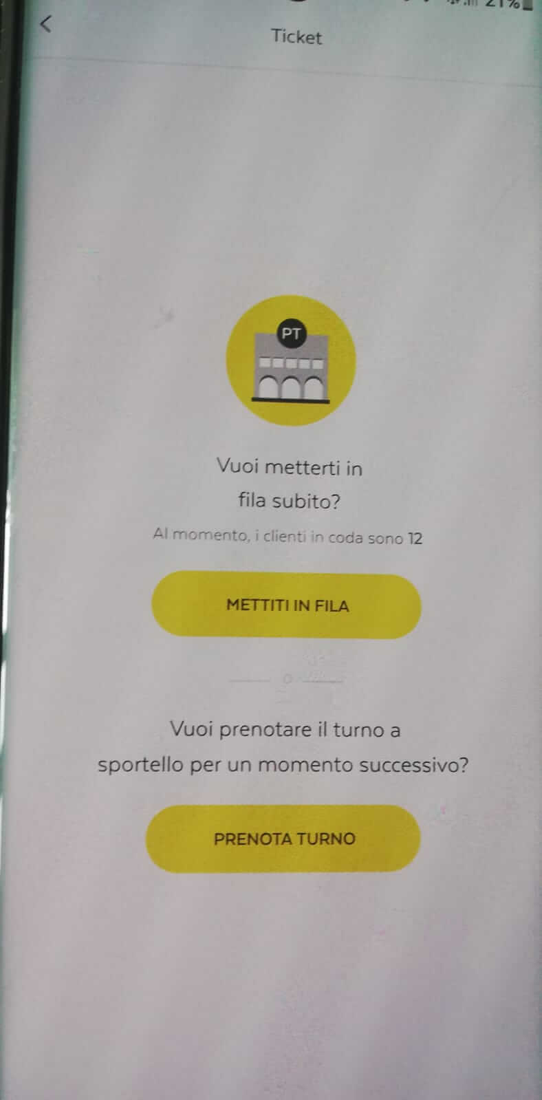 Ho scoperto allora che ora l’app Ufficio Postale delle Poste Italiane consente non solo di prenotare un turno allo sportello per un momento successivo, ma anche richiedere il ticket della fila corrente, analogamente a quanto si può fare da tempo tramite il distributore automatico di ticket presente all’interno dell’ufficio postale… oramai inaccessibile da anni per via della pandemia che ha comportato un ingresso assai scaglionato all’interno degli uffici postali per cui la coda ora viene fatta fuori in strada!