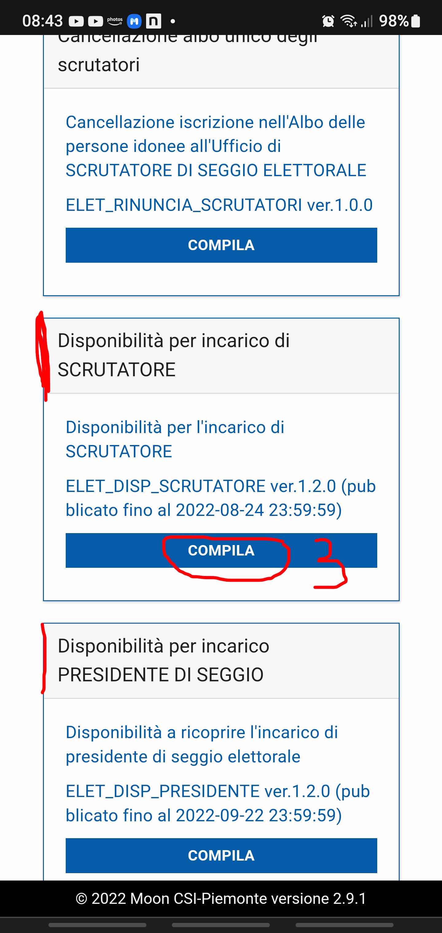 - Scorrere fino alla sezione Disponibilità per incarico di SCRUTATORE e premere il pulsante COMPILA: (ovviamente uno può proporsi anche come PRESIDERNTE di SEGGIO ma in quel caso è assai opportuno avere l’adeguata esperienza in quanto tale incarico richiede assai più responsabilità e conoscenza delle procedure richieste!)