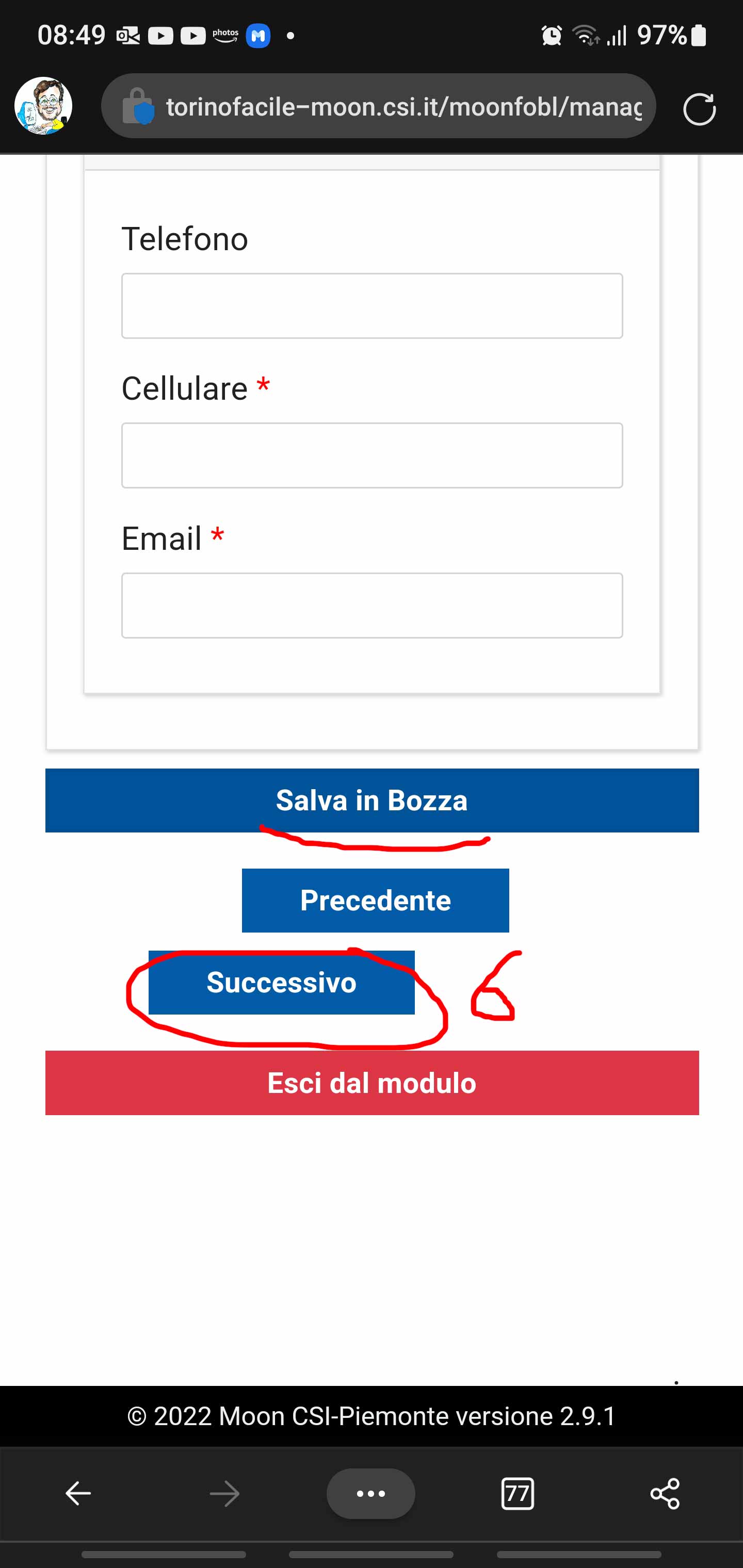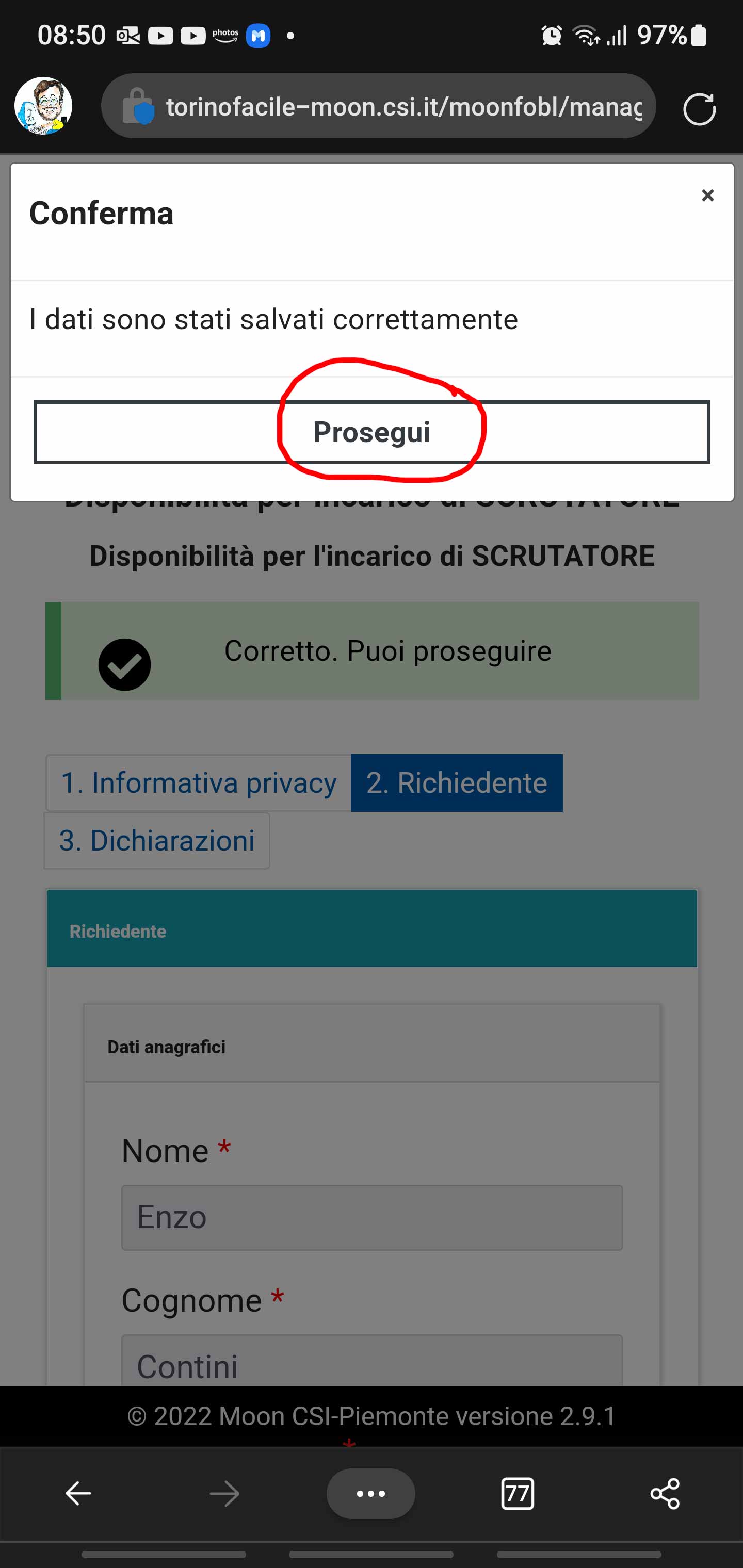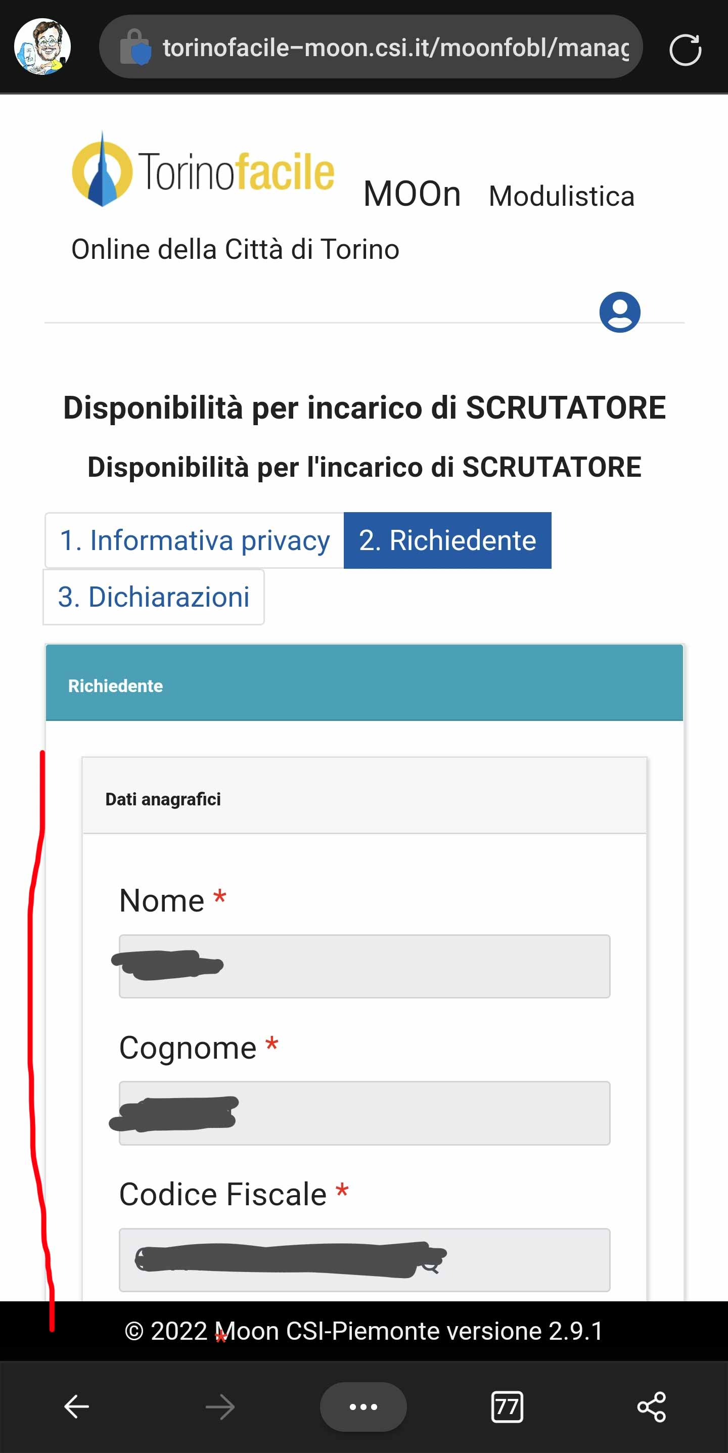 - Si compilano tutti i dati richiesti contrassegnati da un asterisco rosso a indicare che sono indispensabili per poter procedere: si noti che alcune informazioni si trovano già precompilate in quanto si è effettuato un accesso autenticato.