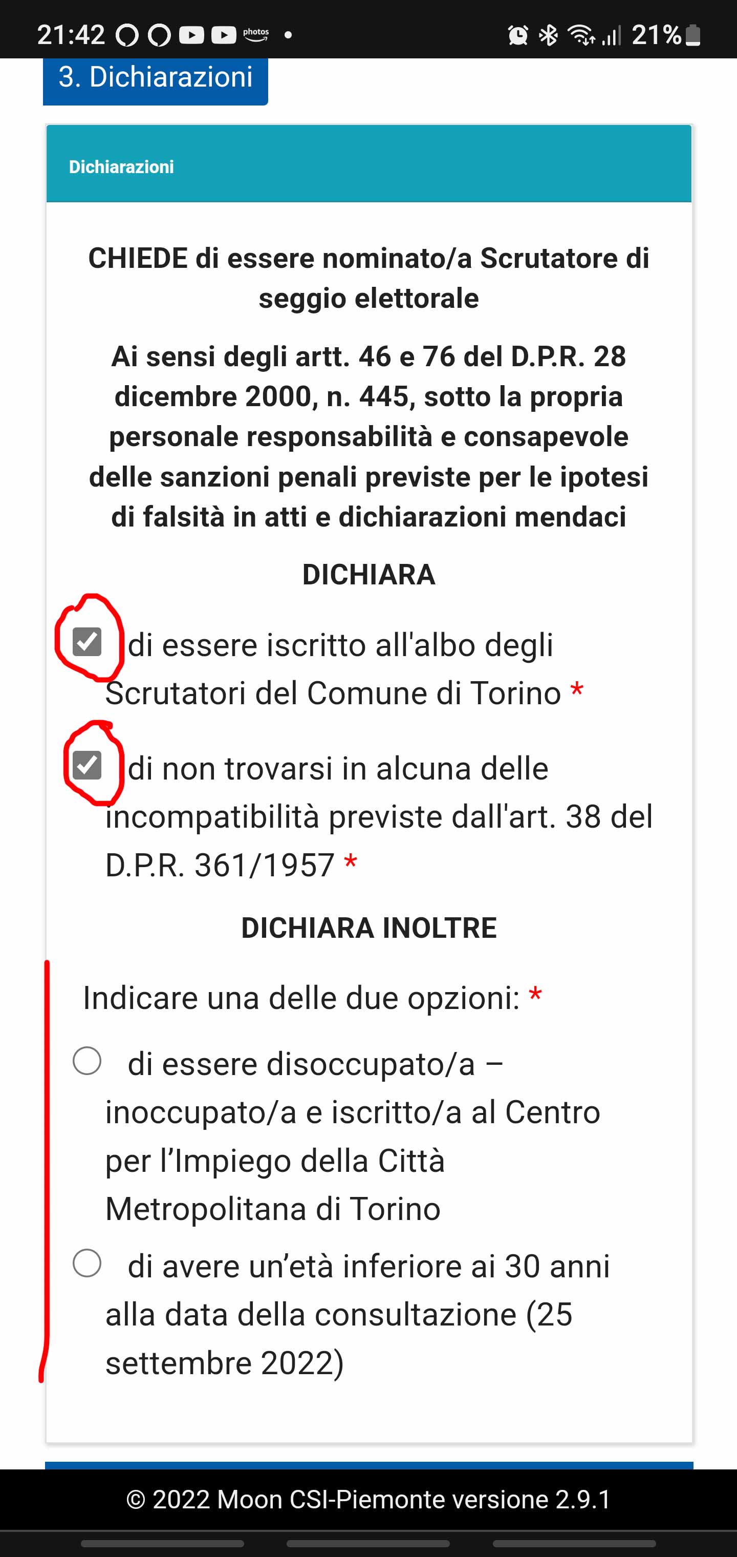 - Si noti che fino al 24/8/2022 per terminare e inviare tale richiesta è indispensabile selezionare almeno una delle dichiarazioni aggiuntive relative alla età inferiore ai 30 anni e/o a essere disoccupato e iscritto alle liste di collocamento. La Commissione Elettorale Comunale nominerà gli iscritti in Albo che si sono dichiarati disponibili secondo l’ordine di arrivo delle dichiarazioni.