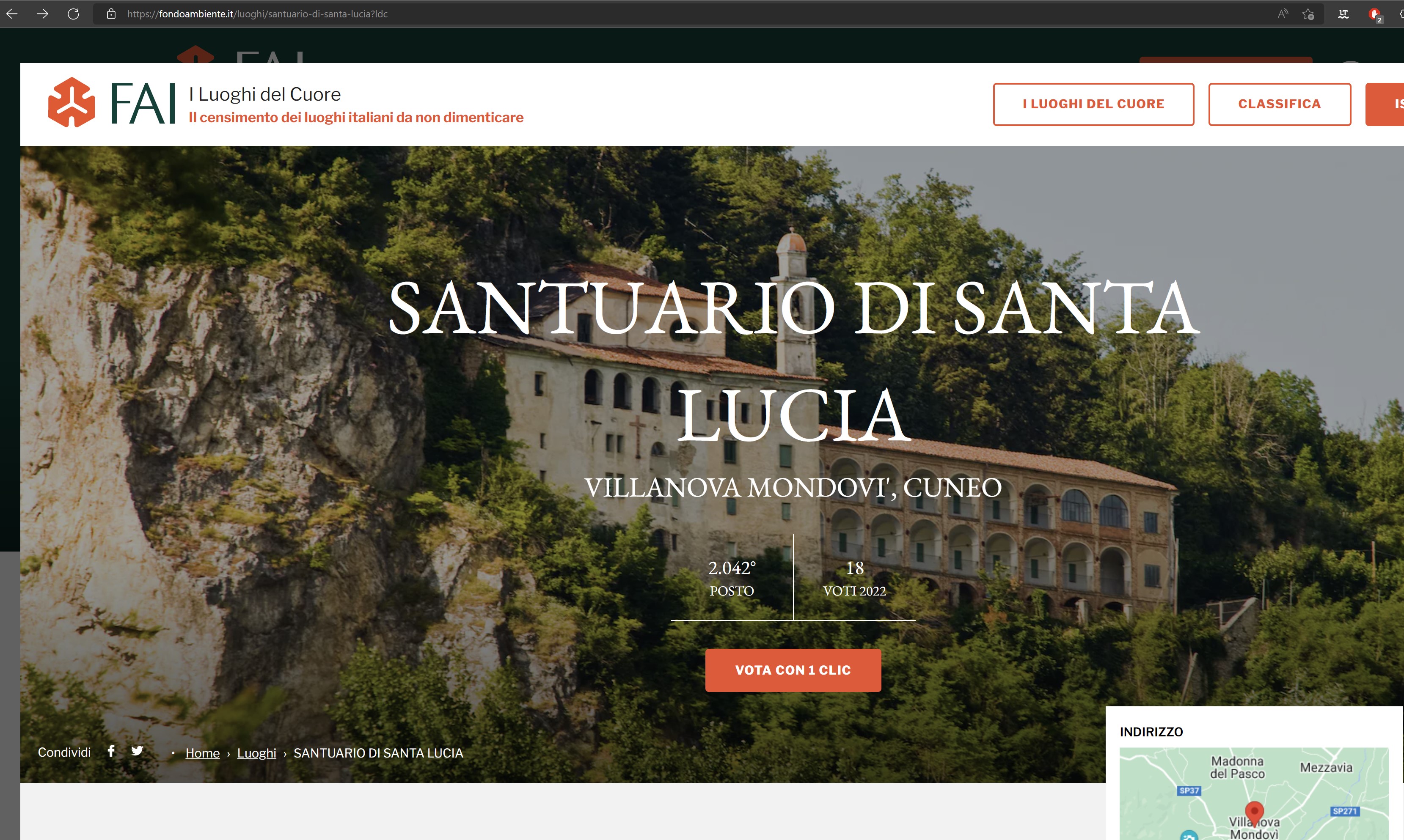 Non rimane, per chi lo desidera, che vedere alcuni di quei luoghi, ora inaccessibili, nel video che avevo fatto lo scorso anno, sperando di poter a breve fotografare nuovamente quelli stessi ristrutturati: ma forse questa è solo un’utopia! Infatti, a nulla era servito, non molti anni fa (2015), essere stato tra i Luoghi del cuore del F.A.I. più votati del cuneese (Tra i luoghi del cuore d’Italia c’è il Santuario di Santa Lucia tra Villanova e Roccaforte Mondovì; “Luoghi del cuore” del Fai: i più votati nella Granda: ai primi posti nella classifica provvisoria i santuari di Villar San Costanzo e Villanova Mondovì e la strada del vallone di Elva), raggiungendo un numero di votazioni impressionante, grazie anche all’impegno di associazioni, volontari e suore.