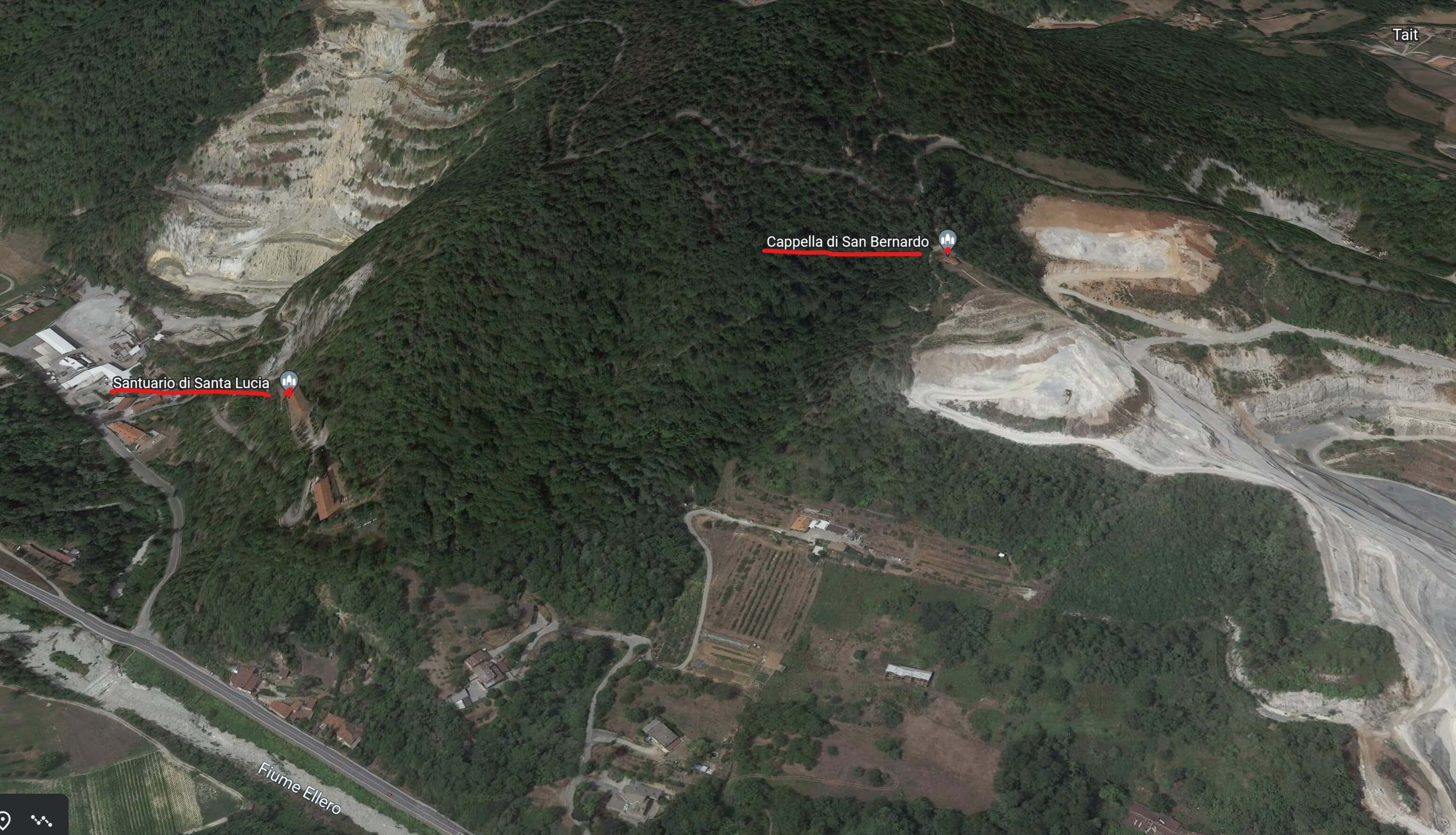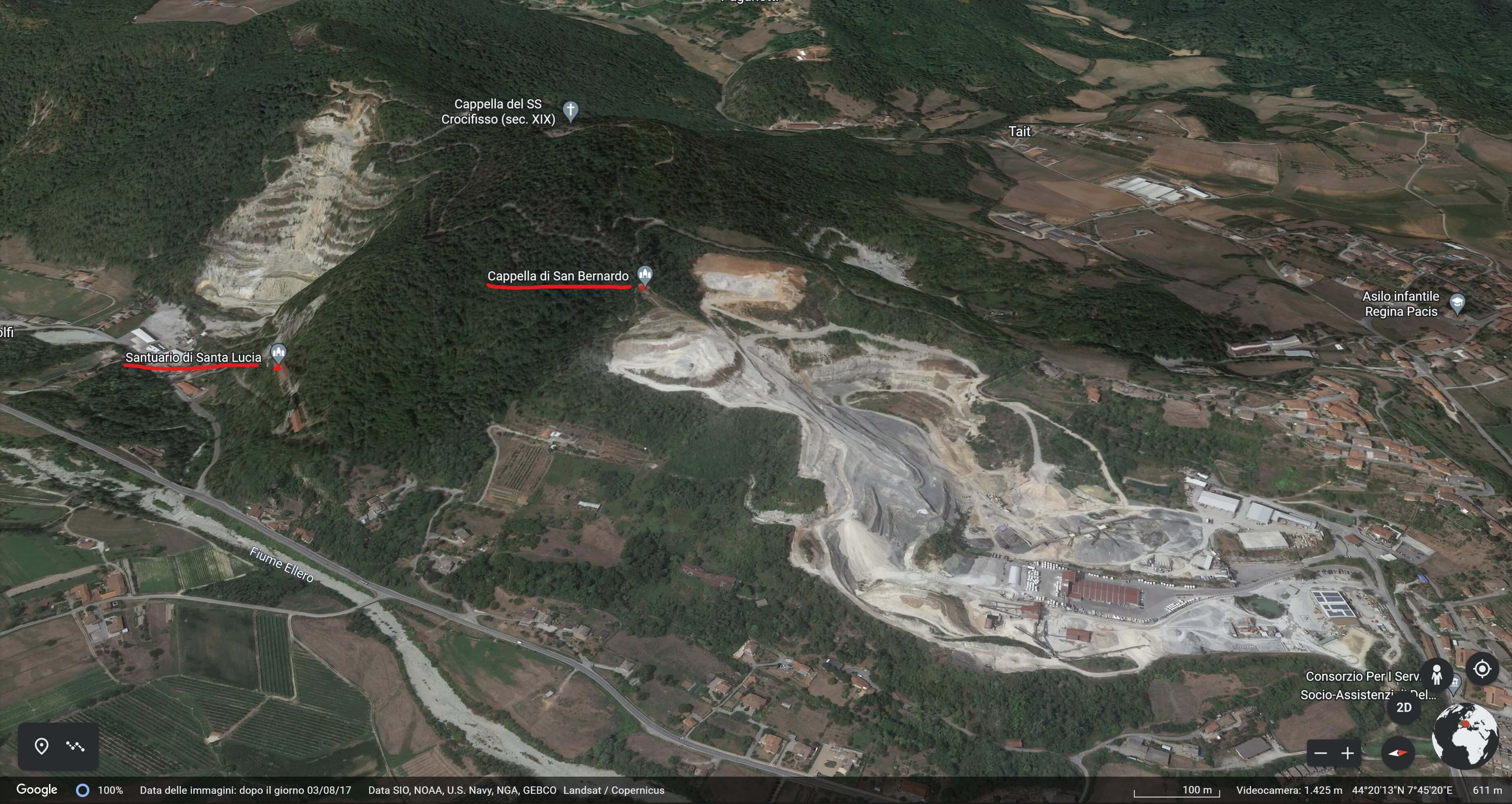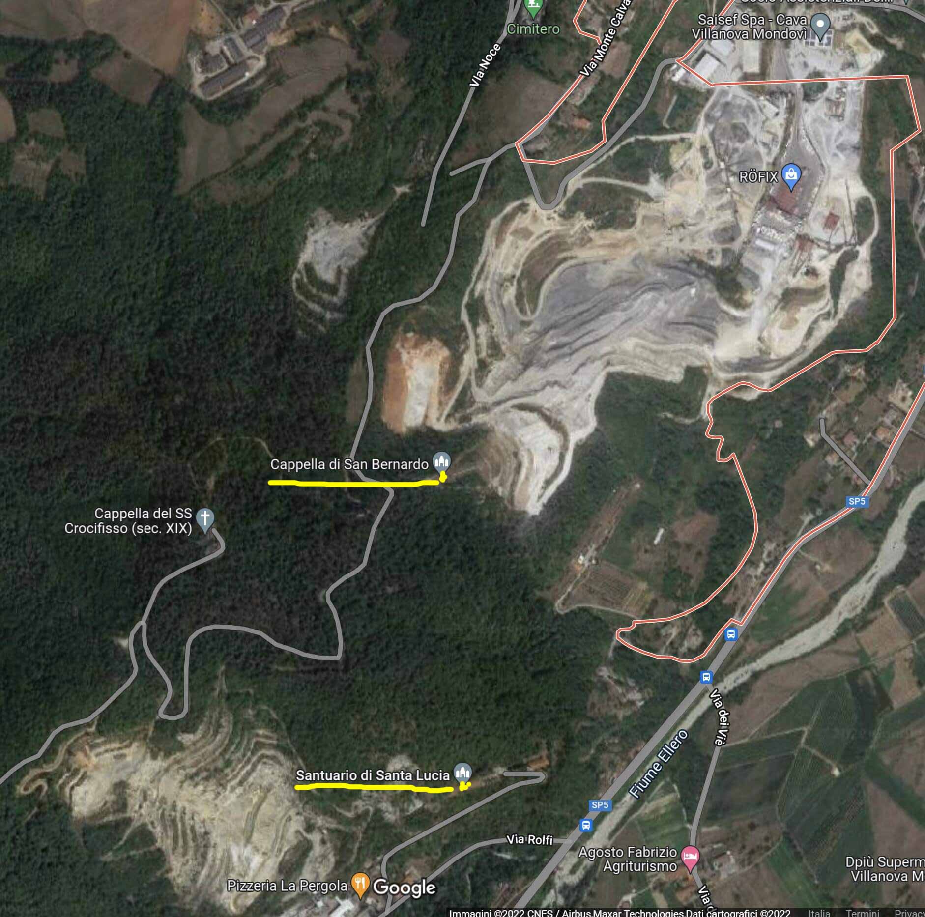 Come si nota chiaramente dalle seguenti riprese da satellite di GMap, l’estensione della cava di Villanova in solo dieci anni (2012 – 2022) si è assai estesa, quasi raddoppiandosi e avvicinandosi sempre più al Santuario: ha quasi oramai nuovamente raggiunto la Cappella di San Bernardo (protetta dalle Belle Arti) che solo pochi anni fa era stata spostata di molto dalla sua sede panoramica originale, proprio per consentire il proseguimento degli scavi. Attualmente la cava ha quasi raggiunto quella Cappella nella sua nuova collocazione di pochi anni fa!