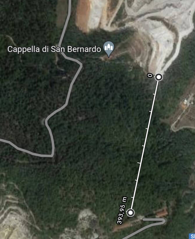 Questa cava di Villanova non è certo così vicina al Santuario come quella inattiva quasi adiacente di Roccaforte, ma in linea d’aria non è poi molto più distante (come si può notare dalle foto da satellite riportate sopra): nel tempo, la sua distanza in linea d’aria si è poi dimezzata nel corso di pochi decenni. Comunque agisce sulla medesima montagna per cui l’effetto delle mine che vengono fatte brillare settimanalmente si ripercuotono nel tempo sicuramente sulle case di Villavecchia (diverse crepe si allargano sui muri di quelle case) e probabilmente anche più distante: varrebbe sicuramente la pena mettere qualche sensore (i.e. quelli che si mettono per registrare i terremoti) nel Santuario per tracciare il loro impatto anche su quel tratto di montagna in cui è collocato. Nelle grotte di Bossea ci sono questi semplici sensori collocati in modo permanente e non penso ci voglia molto – anche in termini economici – per piazzarne qualcuno nel Santuario, magari anche solo per un certo periodo di tempo opportuno!