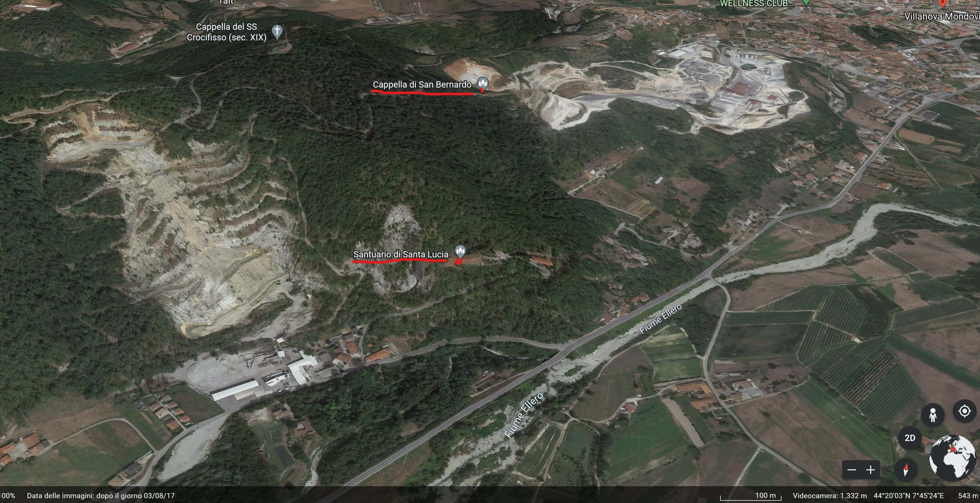 Nell’articolo Villanova: il Tar accoglie il ricorso del Comune: decade il vincolo sul Momburgo si legge: «Abbiamo fatto ricorso contro il vincolo perché a nostro avviso la zona è già sufficientemente tutelata – il commento del sindaco, Michelangelo Turco –, ci sono già i vincoli paesaggistici del Piano regolatore, non c’era bisogno di aggiungere divieti ai divieti, oltretutto creando difficoltà in più a Villavecchia, una zona in cui è difficile convincere i privati a insediarsi o intraprendere interventi di riqualificazione. Poi l’area individuata era molto ampia, scendeva nel Garombo verso Garavagna e andava verso Branzola, creando ulteriori difficoltà alle aziende agricole. Il venir meno del vincolo per noi significa semplicemente meno oneri per chi vuole intervenire sui fabbricati o prendere iniziative». Sul tema dell’espansione dell’attività estrattiva delle cave, che è uno dei temi su cui storicamente verte il dibattito, Turco precisa: «Le cave seguono le loro normative e i loro canali, le autorizzazioni non fanno nemmeno capo al Comune. Oltretutto vedo particolarmente improbabile un’espansione verso Monte Calvario, visto che la zona della cava in quella direzione è già stata tutta recuperata, addirittura con le semine verdi in funzione. Oltretutto Monte Calvario è una zona di proprietà comunale». Il vincolo paesaggistico effettivamente ha comportato inutili burocrazie e ha sicuramente ostacolato interventi di riqualificazione di edifici della zona, ma basterebbe escludere le aree abitate e mantenerlo nel territorio boschivo del Momburgo, garantendo quindi quella protezione contro lo sfruttamento delle sue risorse. Relativamente alle concessioni date alle cave, si afferma che non fanno capo al Comune senza tuttavia precisare a chi competono! Mi chiedo: chi allora è il responsabile delle autorizzazioni che, decennio dopo decennio, hanno permesso il perpetuarsi di questo scempio ambientale? Per il mantenimento di poche decine di posti di lavoro ed il profitto di pochi, si è continuato a distruggere un vasto territorio che avrebbe potuto offrire ben altre possibilità alla popolazione locale, anche in termini di richiamo turistico e quindi con un positivo impatto economico sulle attività commerciali della zona. L’affermazione che sia particolarmente improbabile un’espansione verso Monte Calvario, mi sembra poi alquanto azzardata anche solo guardando quanto è avvenuto nell’ultimo decennio, come si evince dalle precedenti immagini via satellite. Si noti come la parete di montagna erosa negli ultimi 10 anni (immagine a sinistra: circa 318 metri per un’altezza di circa 124 metri) disti in linea d’aria poco meno della distanza tra l’estremo della cava e il Santuario di Santa Lucia (immagine a destra: circa 393 metri). Questo significa che, se gli scavi continueranno con la medesima intensità (che, in verità, è sempre cresciuta negli anni), nel giro di meno di 20 anni potrebbe arrivare ad interessare davvero assai da vicino il versante in cui è presente il Santuario! Si noti tra l’altro che la cava di Villanova Mondovì stà già interessando un territorio (circa 670 metri di altezza) più in alto del Santuario (circa 614 metri di altezza).