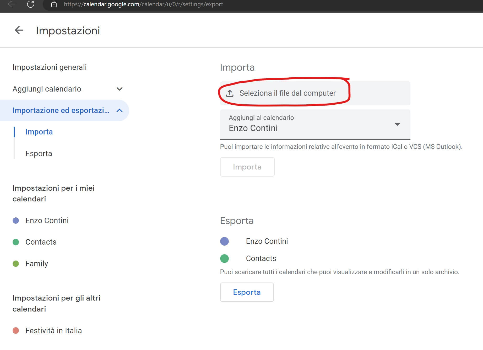 Basta installare e lanciare quell’app, selezionare Export e scegliere il nome con cui si desidera salvare quel file che conterrà tutti gli eventi programmati. Mi raccomando d’impostare un nomefile univoco (e.g. MioCalendario) in modo tale che si riesca facilmente a ricercare nella memoria dello smartphone. Infatti, non è immediato sapere dove quel file venga salvato da quell’app e io, senza perdere tempo, ho semplicemente aperto una qualsiasi app che consenta di esplorare il file system (quello proprietario preinstallato sul telefonino o qualsiasi altro quale, ad esempio, File Manager) e poi ho effettuato la ricerca di quel file indicandone il nome (e.g. Mio Calendario). Una volta trovato, l’ho selezionato e ho richiesto l’opzione di condivisione (e.g. tramite email o WhatsApp). In questo modo ho potuto avere quel file con estensione .ics sul mio PC (i.e. leggendo l’email e salvandone l’allegato o salvando il messaggio arrivato con WhatsApp Web o oon l’app WhatApp su PC). Infine, ho importato quei dati nel mio calendario Google accendendo a questa sua pagina d’importazione con il mio account Google, ovviamente poi scegliendo (tramite Seleziona il file dal computer) quel file (precedentemente creato e scaricato su quel mio PC) e premendo quindi il tasto Importa: