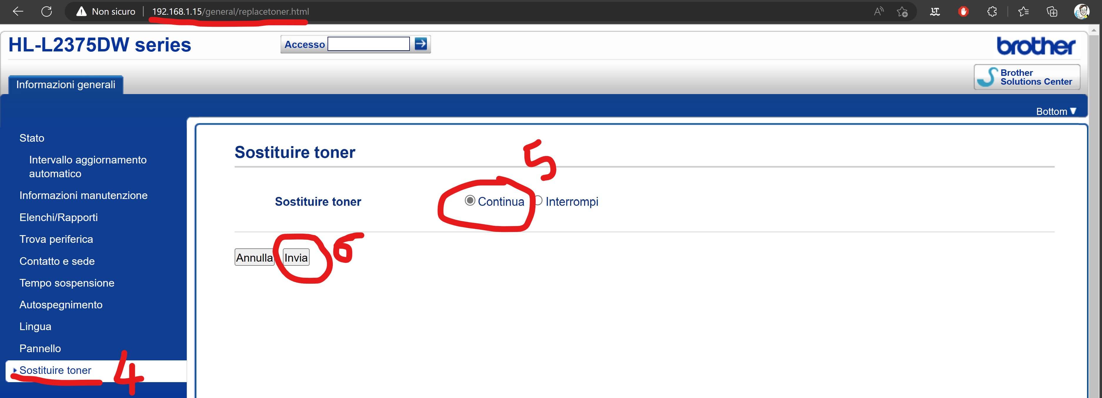 Da quel sito locale e presente nella stampate stessa (e.g. http://192.168.1.15/general/status.html), aperto in automatico sul proprio browser di default, andando nella sezione Sostituzione toner, si può impostare l’opzione Continua (alternativa a quella Interrompi di default) e quindi premere Invia per inviare alla stampante questa scelta: