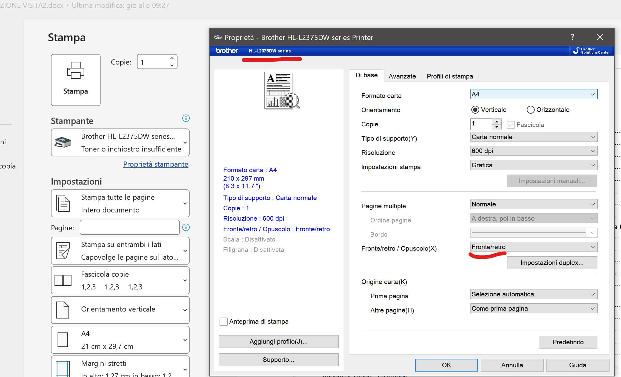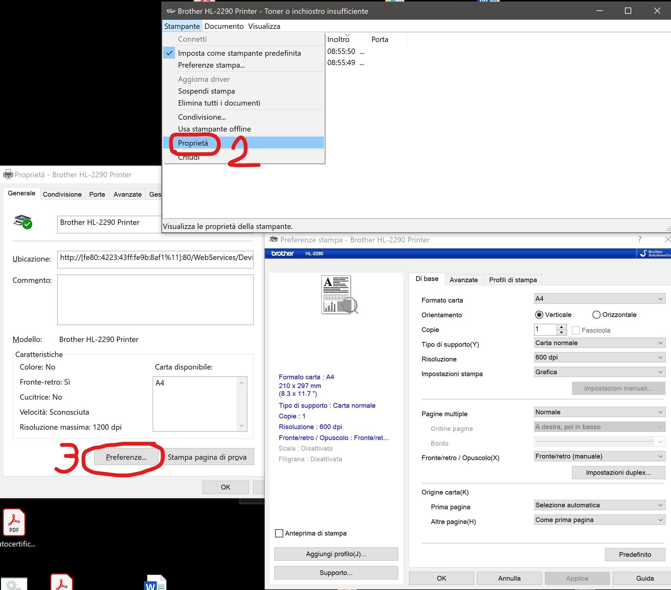 Se poi non riesci a stampare fronte/retro sebbene il tuo modello supporti tale funzione, sicuramente ti sei sbagliato a scegliere il modello (come è inizialmente successo a me!) scaricando il SW e in particolare il suo driver. Andando nelle sue proprietà infatti è possibile solo impostare pagine multiple fronte /retro con inserimento manuale… essendo il modello Brother HL-2290 (relativo a quel driver) solo in grado di supportare tale modalità: