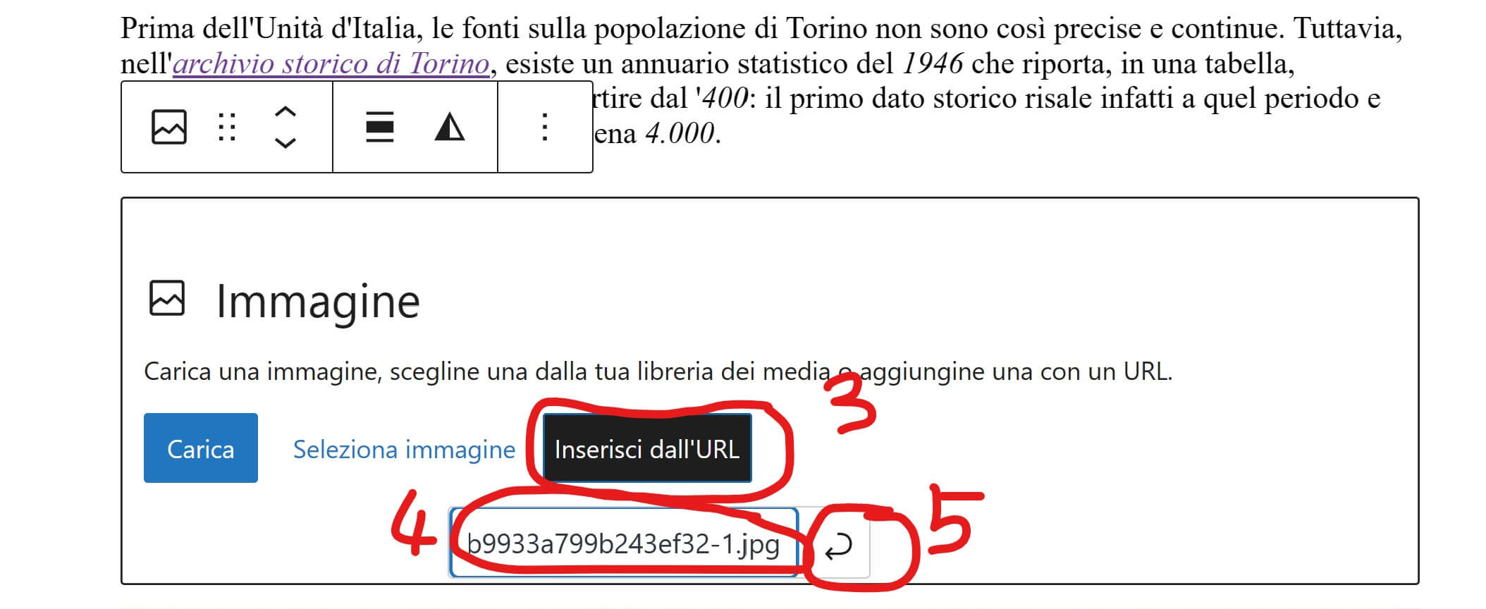 Se si desidera invece inserirla per poi poteva eventualmente dimensionare in dimensioni, sui deve operare diversamente come segue, cioè inserendo una immagine indicandone la URL esterna. A questo punto sul contorno dell’immagine inserita compare un pallino che consente, trascinandolo di modificare le dimensioni o si può anche agire sulle proprietà del blocco operando nel la sezione a destra, ad esempio impostandone una percentuale (e.g. 50%):