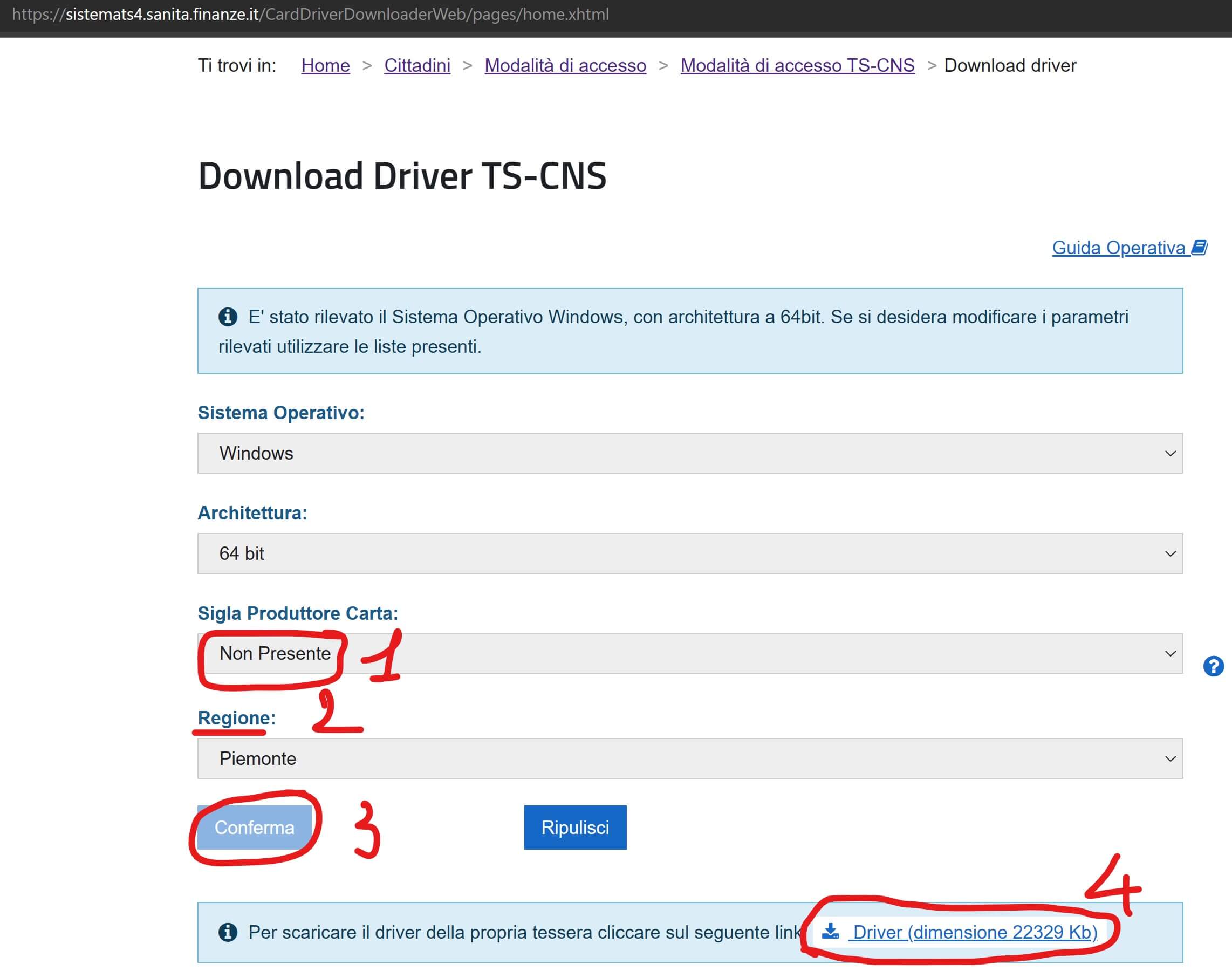 Cliccando quindi sul primo link si arriva alla seguente pagina che ha già alcuni campi precompilati in base alla tipologia del proprio computer: resta solo da indicare la sigla del produttore della propria carta sanitaria! … e sì, perché evidentemente il SW da installare cambia a seconda di questo parametro! 🙄😮