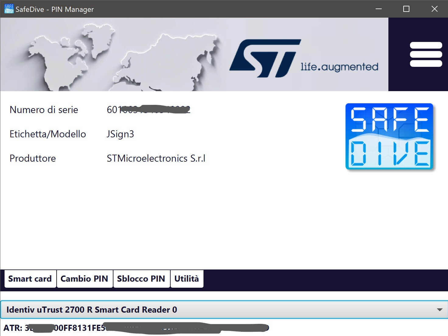 Lanciando l’app SafeDive 2022 si ottengono le informazioni relative alla carta, quando inserita nel lettore: sono presenti voci che consentono di operare sulla stessa (e.g. Sblocco PIN, Cambio PIN che tuttavia personalmente non ho utilizzato… non si da mai!):
