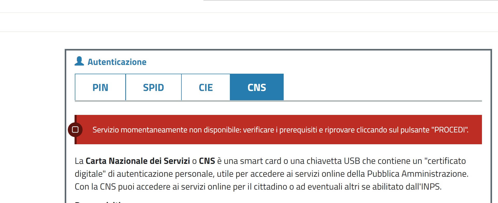 Nel seguito alcuni esempi di segnalazione di errore che ho ricevuto durante le poche prove di accesso a alcuni siti che propongono la CNS come possibile modalità.