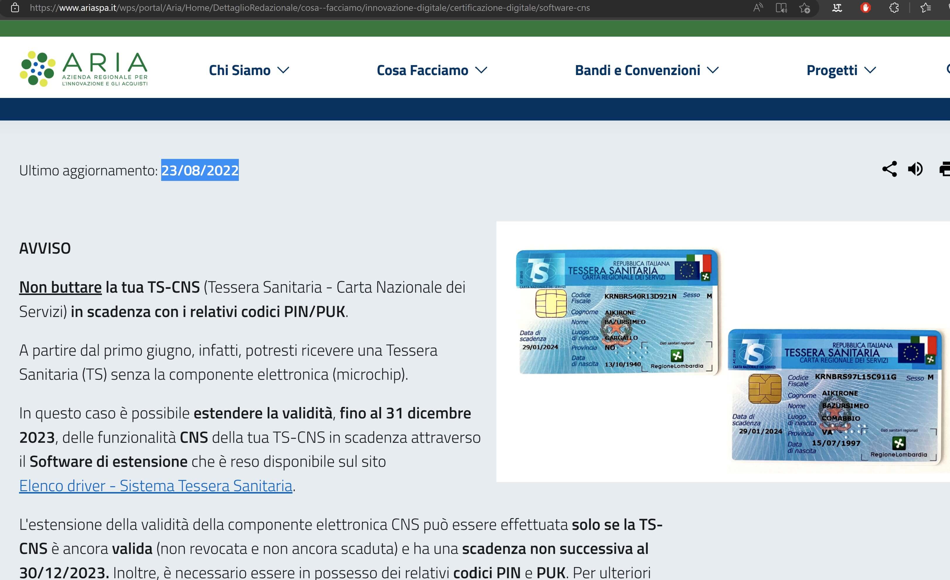 “Non buttare la tua TS-CNS (Tessera Sanitaria – Carta Nazionale dei Servizi) in scadenza con i relativi codici PIN/PUK. A partire dal primo giugno, infatti, potresti ricevere una Tessera Sanitaria (TS) senza la componente elettronica (microchip). In questo caso è possibile estendere la validità, fino al 31 dicembre 2023, delle funzionalità CNS della tua TS-CNS in scadenza attraverso il Software di estensione che è reso disponibile sul sito Elenco driver – Sistema Tessera Sanitaria“.