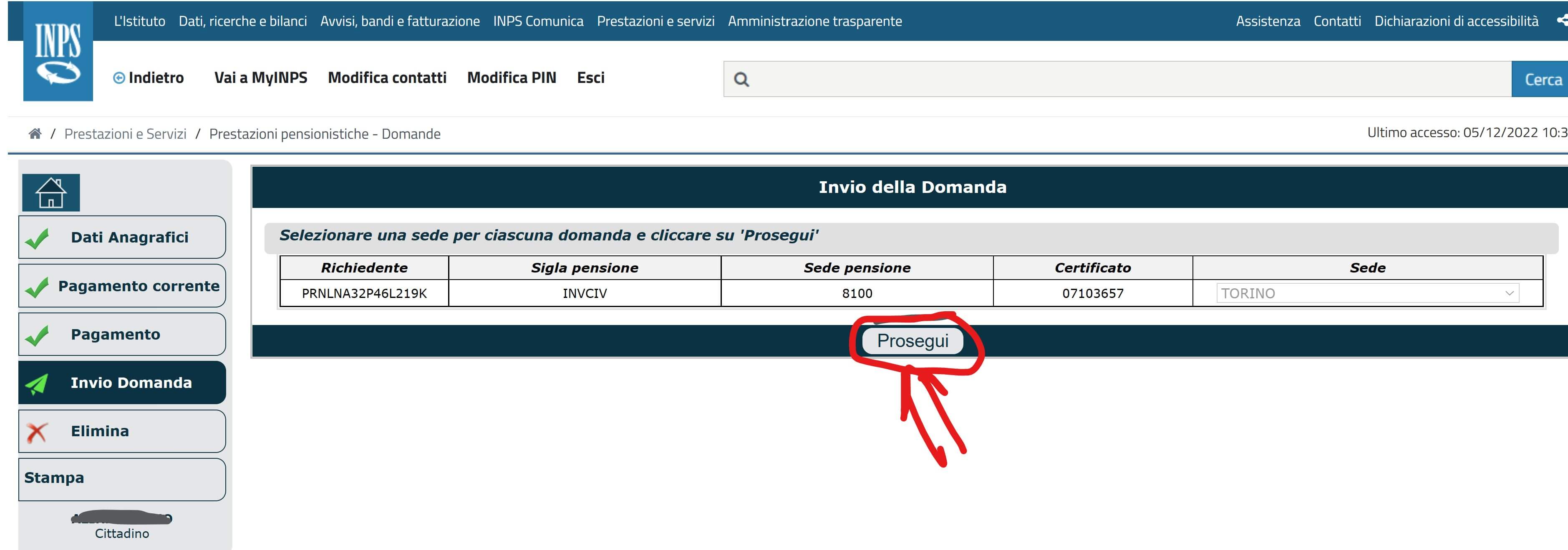 - ATTENZIONE – Anche dopo avere indicato il nuovo IBAN e premuto il tasto Salva e prosegui, la procedura non è ancora terminata! È indispensabile proseguire ancora, indicando la sede (nel mio caso era già predefinita a Torino) a cui inviare la richiesta di variazione, premere Prosegui; poi, nella successiva videata, selezionare di avere letto l’informativa e finalmente premere il tasto Invia Domanda!!