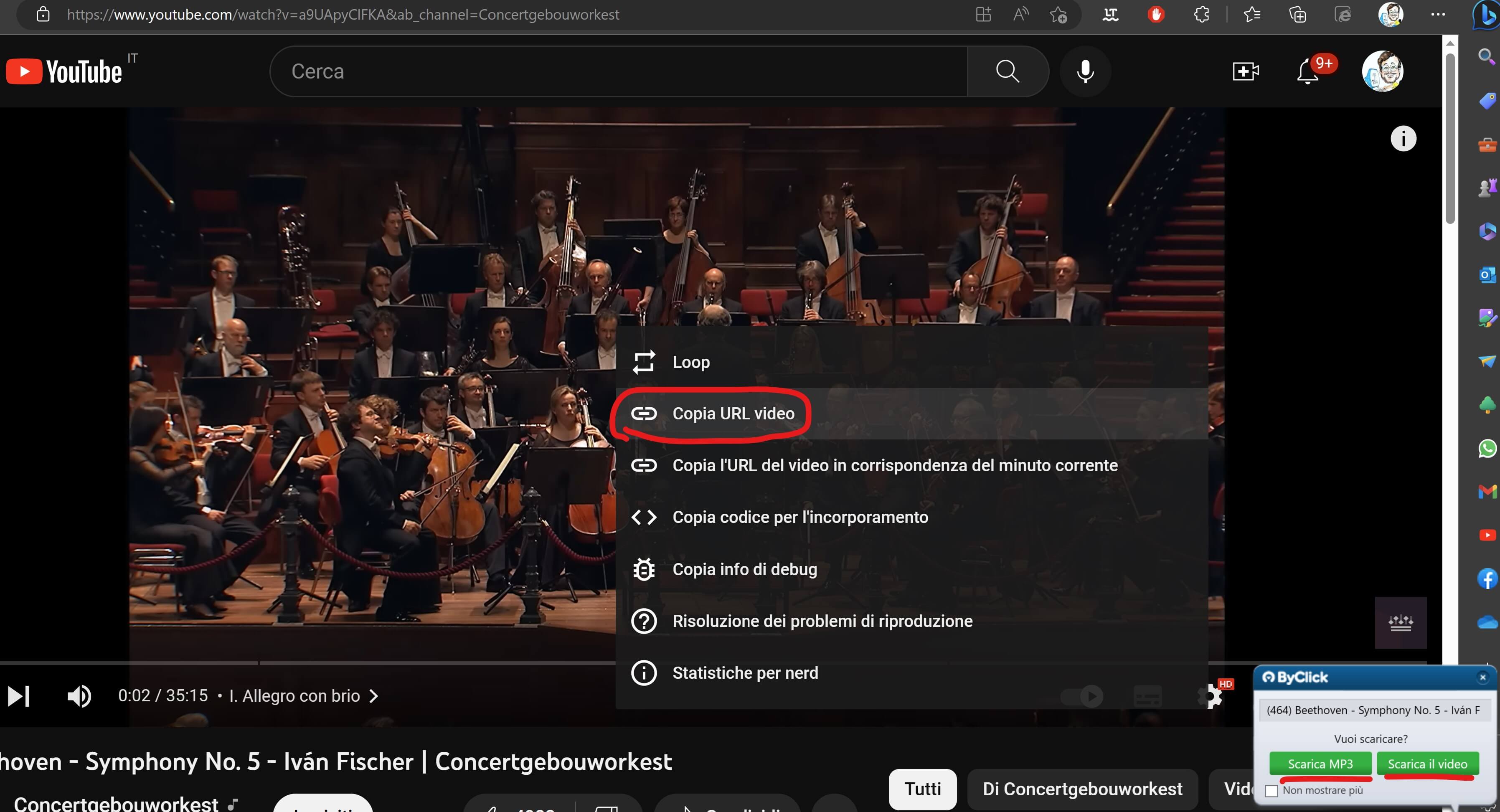 Se ByClick è in esecuzione, se vai su un video di YouTube, apparirà una finestra popup che ti chiede se vuoi scaricare quel video (MP4) o solo il suo audio (MP3): in ogni modo puoi sempre copiare l’URL del video (click con il tasto destro e seleziona Copia URL video) per poi incollarlo nel campo appropriato (2) in ByClick e quindi premere il pulsante Scarica: