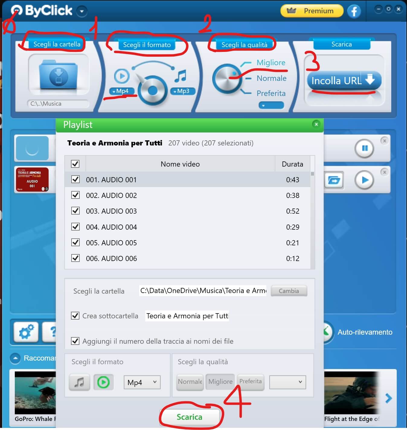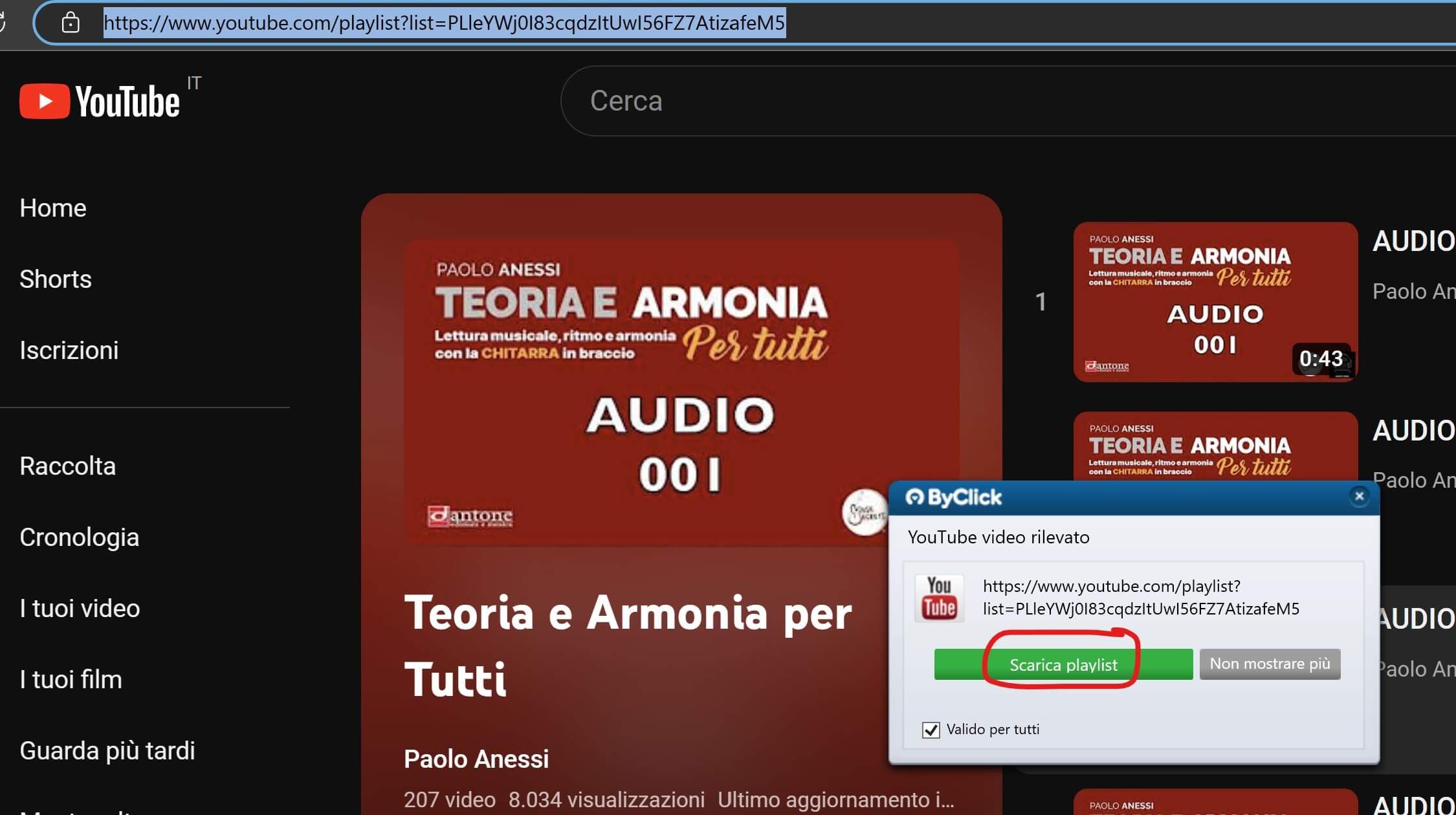 Ho da poco acquistato il bel libro di Paolo Anessi su Teoria e Armonia per tutti che mi è sembrato assai valido già dopo aver ascoltato la presentazione fatta online dall’autore stesso: uno dei suoi punti di forza sono sicuramente gli innumerevoli audio/video resi disponibili online. Tuttavia, una volta ricevuto il libro, ho notato che veniva fornito solo il questo link che rimanda a una playlist su YouTube di ben 207 elementi, tra audio e video… scaricabili solo singolarmente!