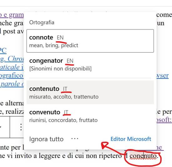 Posizionando il cursore sopra la parola sottolineata in rosso, viene suggerito dall’Editor Microsoft, le possibili correzioni, fornendo anche una descrizione del significato della parola suggerita, caratteristica interessante non presente generalmente nei correttori.