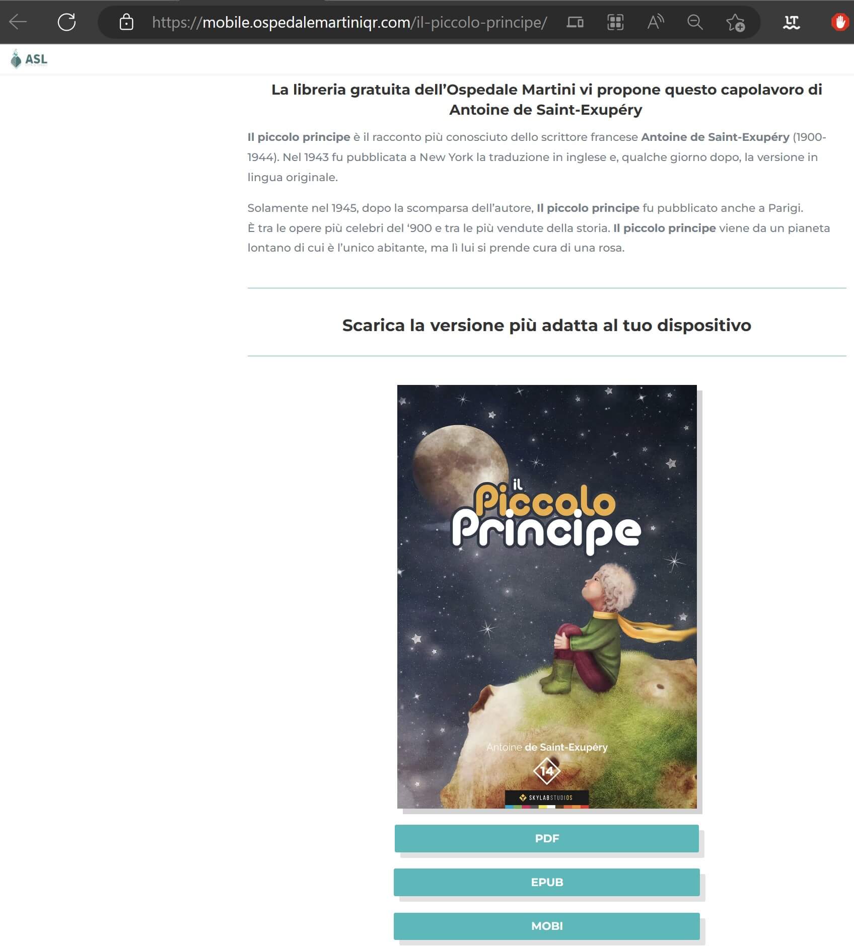 Ecco come si presenta, a titolo d’esempio, la pagina per poter scaricare il capolavoro di Antoine de Saint-Exupéry, “Il Piccolo Principe“: