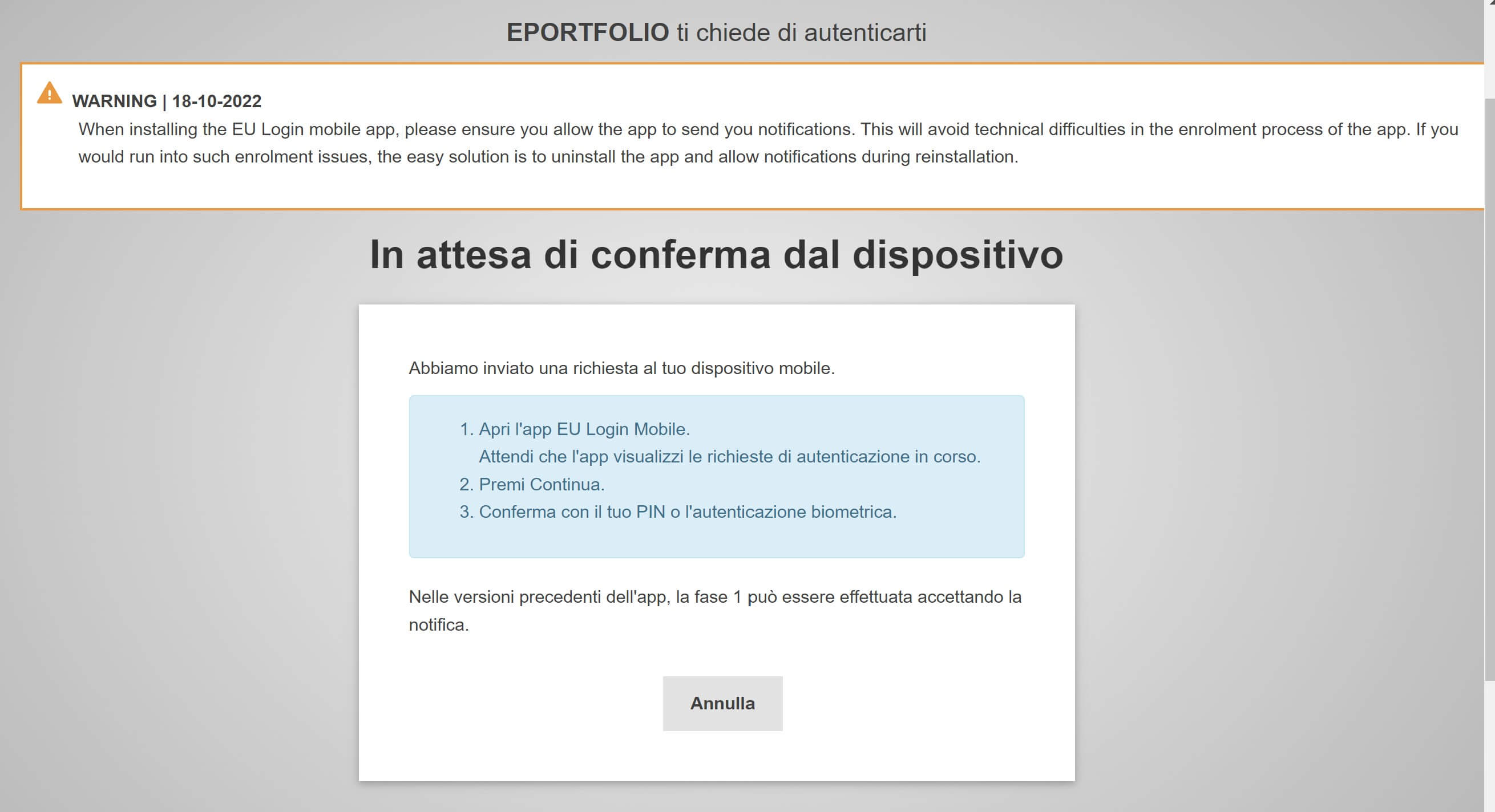 Quando quindi si cercherà di accedere al sito https://europa.eu/europass/it si dovrà scegliere quel metodo di verifica tramite l’app EU Login. Lanciando quindi sullo smartphone l’app EU Login, comparirà sul telefonino una finestra che indica la presenza di una richiesta di autenticazione in corso e quindi, accettando di proseguire, comparirà una finestra di quell’app che richiede l’inserimento del PIN (o, in alternativa se uno lo aveva impostato, una autenticazione biometrica se attivata sul cellulare).