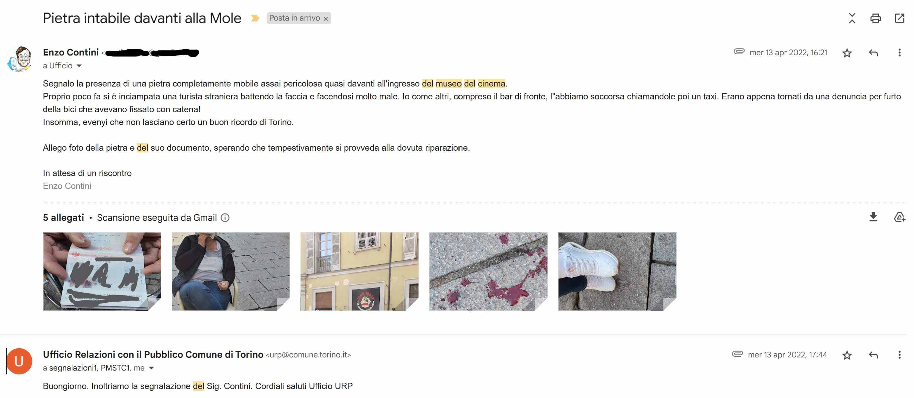 Quasi un anno fa, precisamente il 13/4/2022, avevo segnalato all’URP di Torino la presenza, nei pressi dell’ingresso del Museo del cinema e di fronte alla Mole Antonelliana, di una pietra completamente mobile e quindi assai pericolosa.