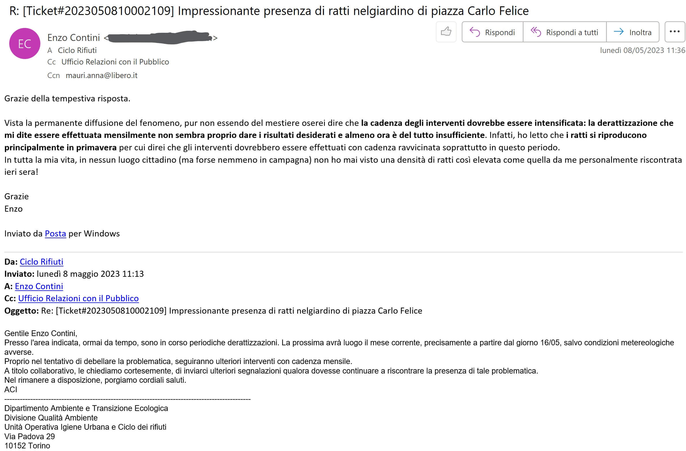Nel giro di meno di un’ora ho ricevuto una risposta anche dalla Unità Operativa Igiene Urbana e Ciclo dei rifiuti: “Presso l’area indicata, ormai da tempo, sono in corso periodiche derattizzazioni. La prossima avrà luogo il mese corrente, precisamente a partire dal giorno 16/05, salvo condizioni metereologiche avverse. Proprio nel tentativo di debellare la problematica, seguiranno ulteriori interventi con cadenza mensile. A titolo collaborativo, le chiediamo cortesemente, di inviarci ulteriori segnalazioni qualora dovesse continuare a riscontrare la presenza di tale problematica.