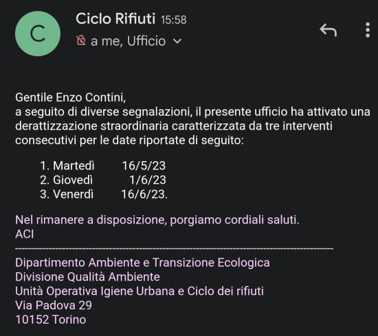 P.S. 15/5/2023 – Ricevuta email in cui mi viene notificato che, a seguito di diverse segnalazioni, hanno attivato una derattizzazione straordinaria caratterizzata da tre interventi consecutivi (16/5/2023; 1/6/2023; 16/6/2023). Quindi segnalare serve!!!