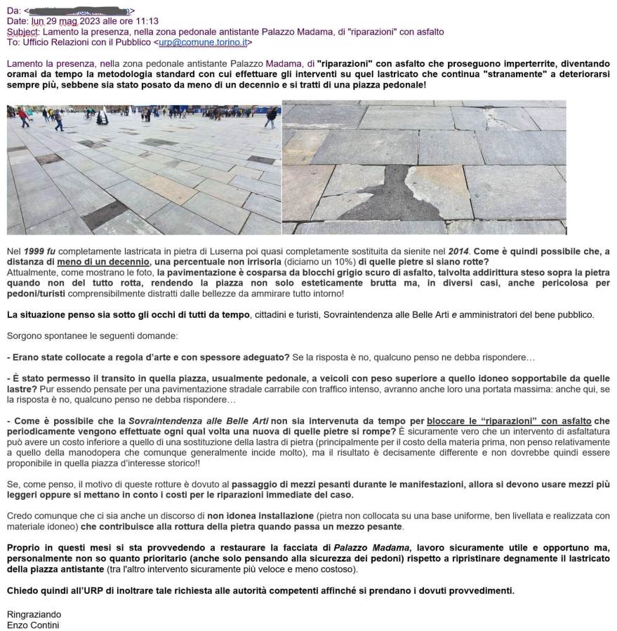 L’area pedonale di Piazza Castello a Torino e quelle indecorose riparazioni con asfalto del lastricato in pietra